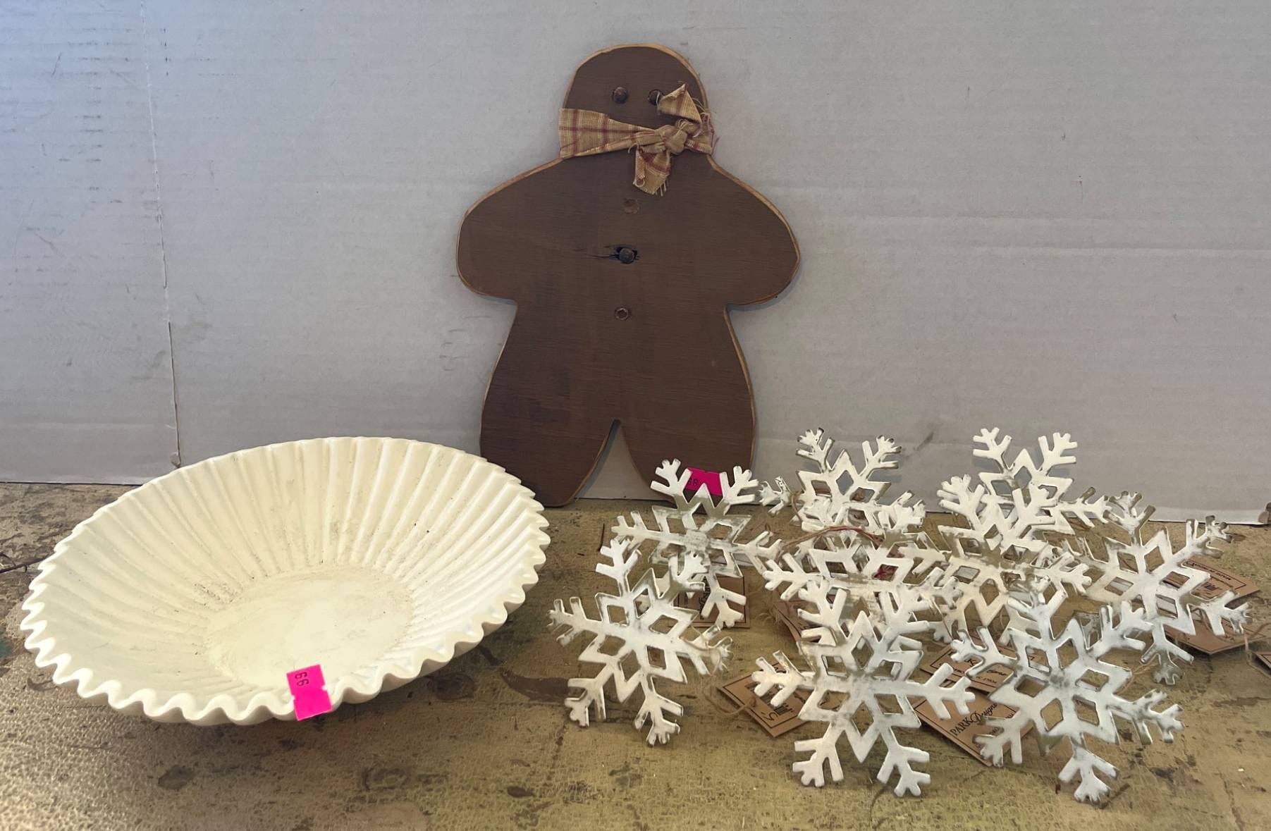 66 White Plastic Bowl, Gingerbread Figure, and 9 Snowflake Napkin Rings