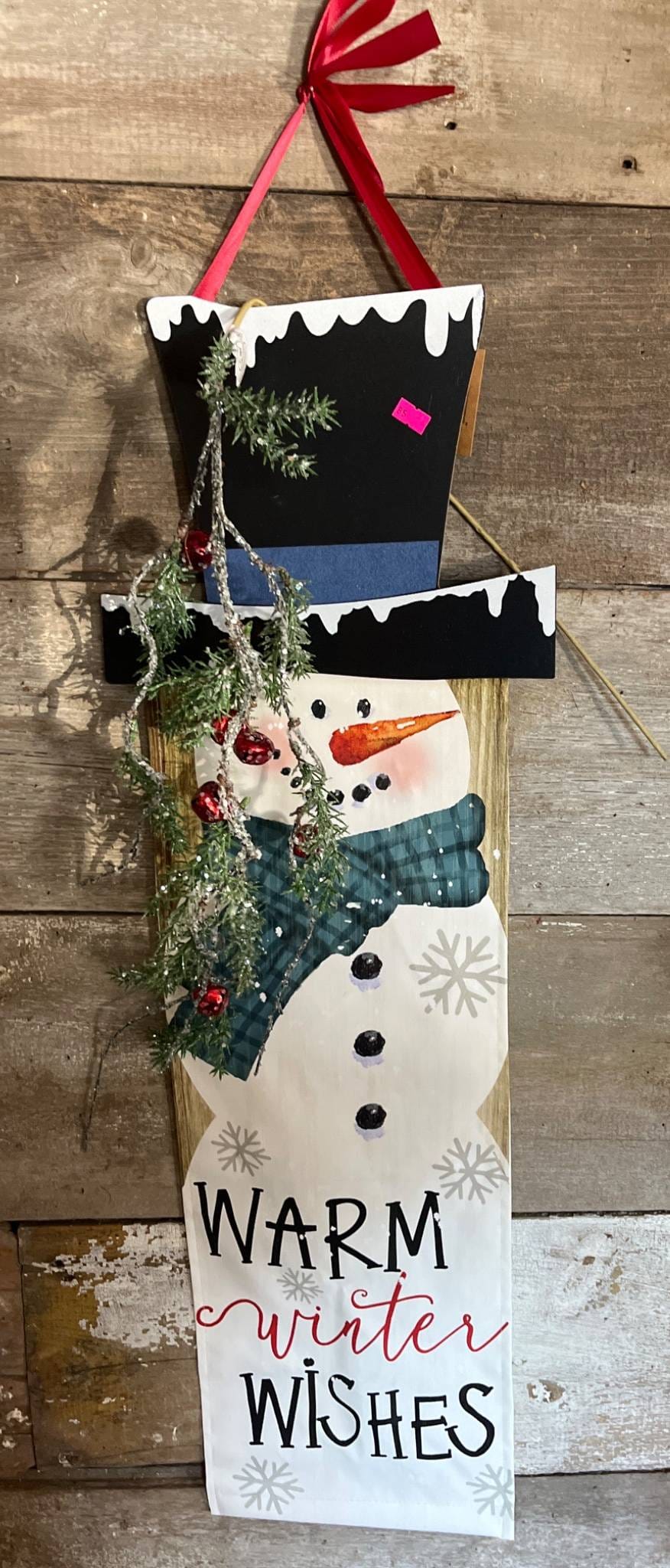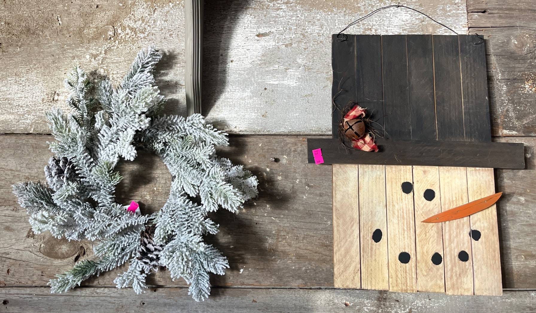 73 Frosted Pine Wreath and Wooden Snowman Wall Decoration