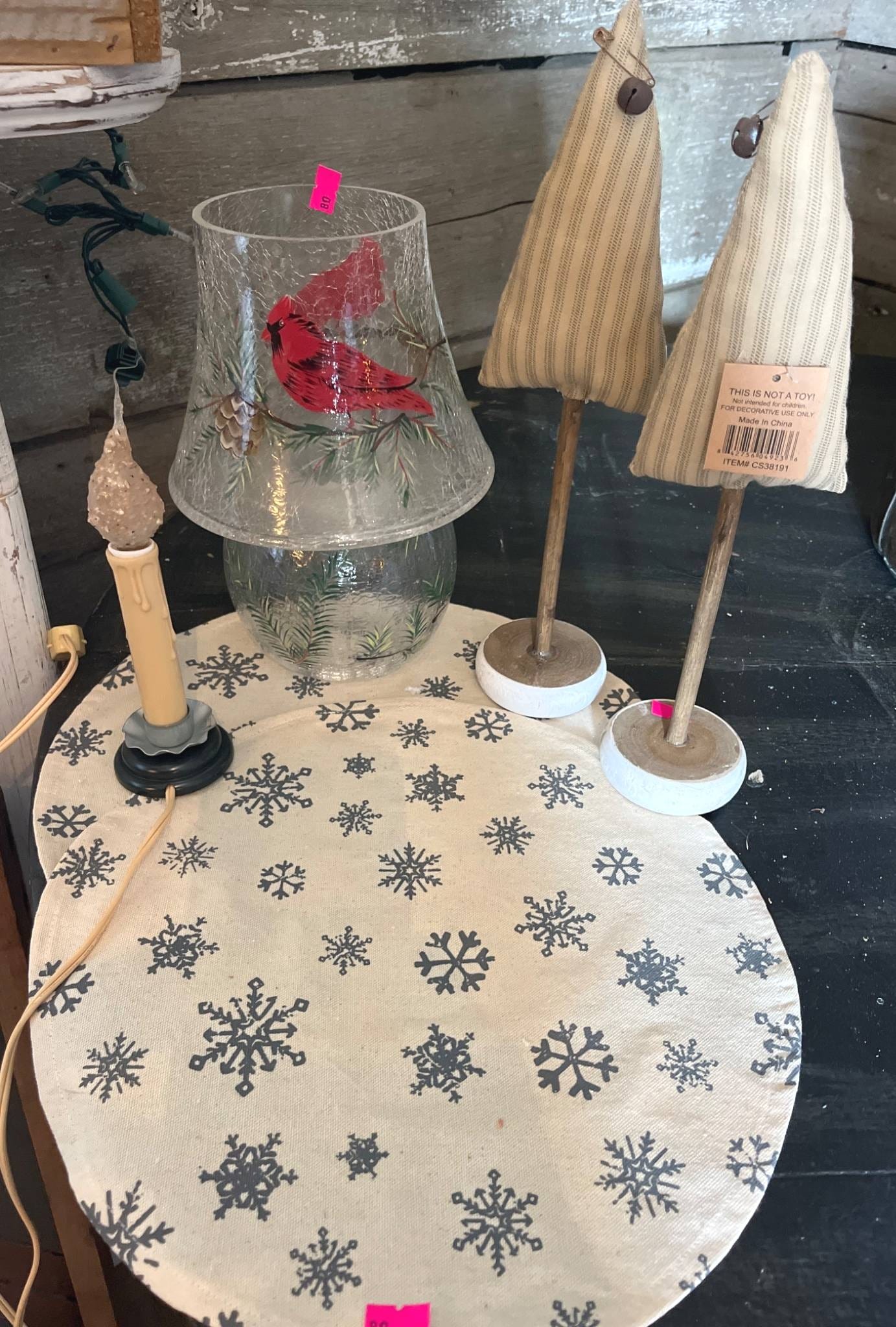 80 Cardinal Glass Candle Lamp, Fabric Trees, Snowflake Mats, and Electric Candle