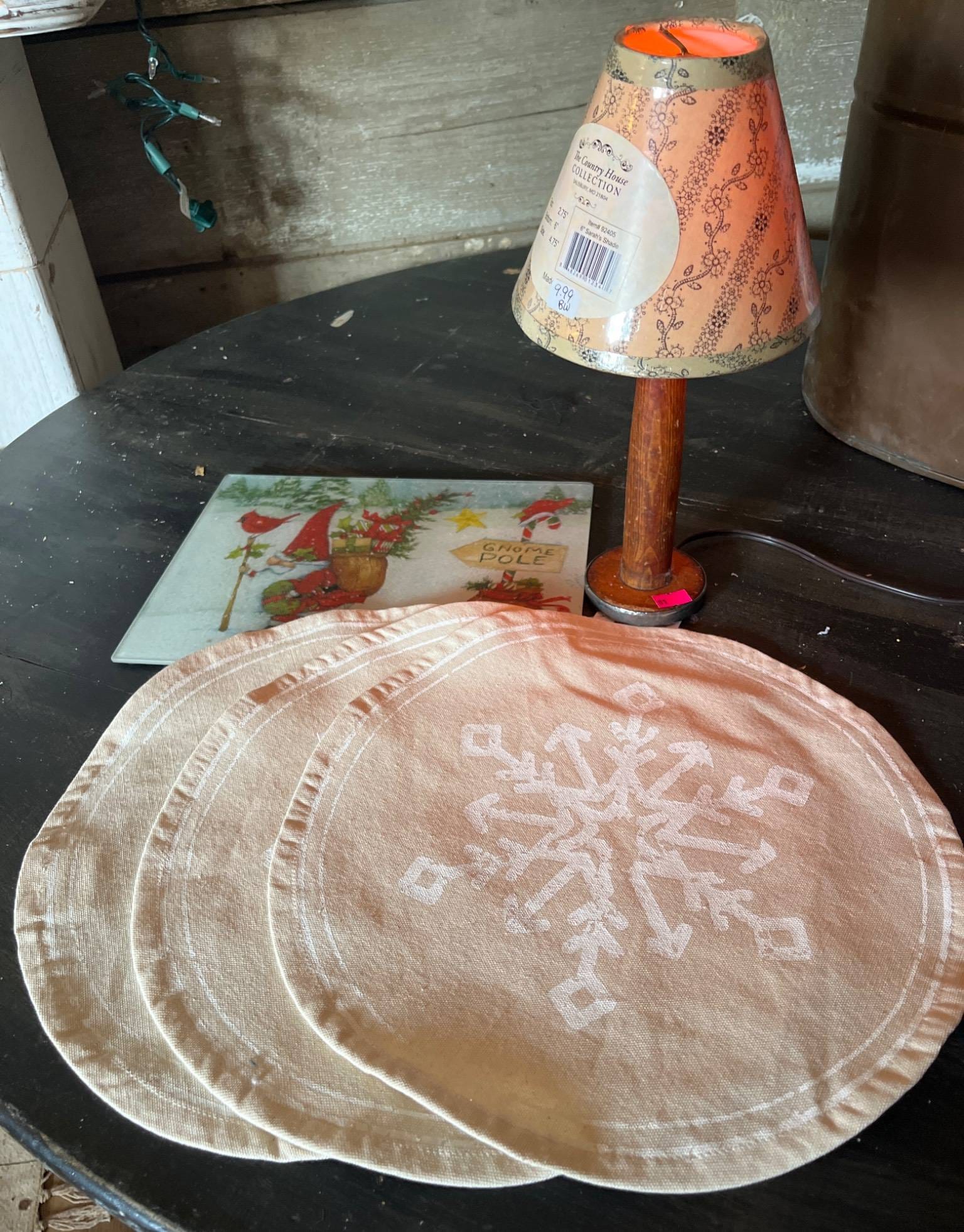 81 Round Snowflake Mats, Glass Gnome Cutting Board, and Table Lamp