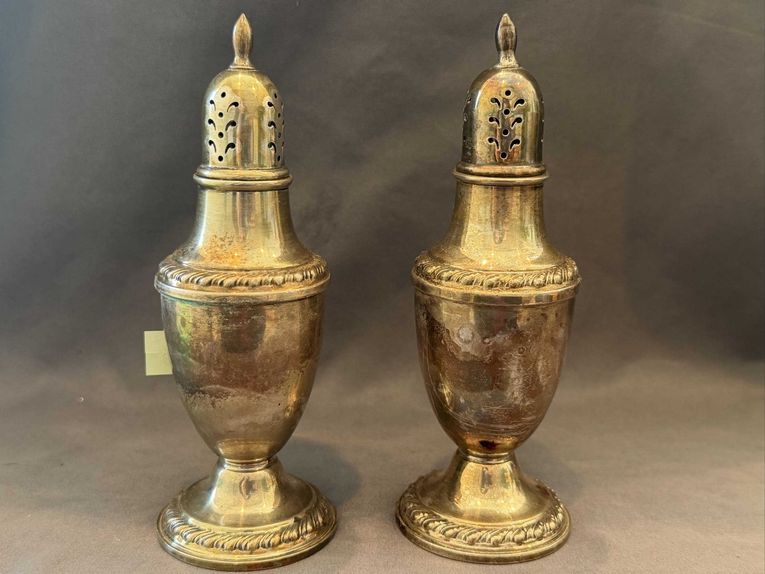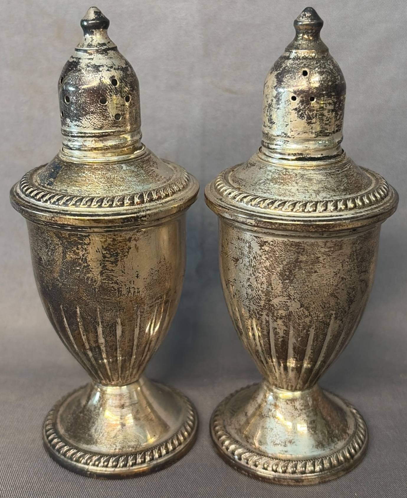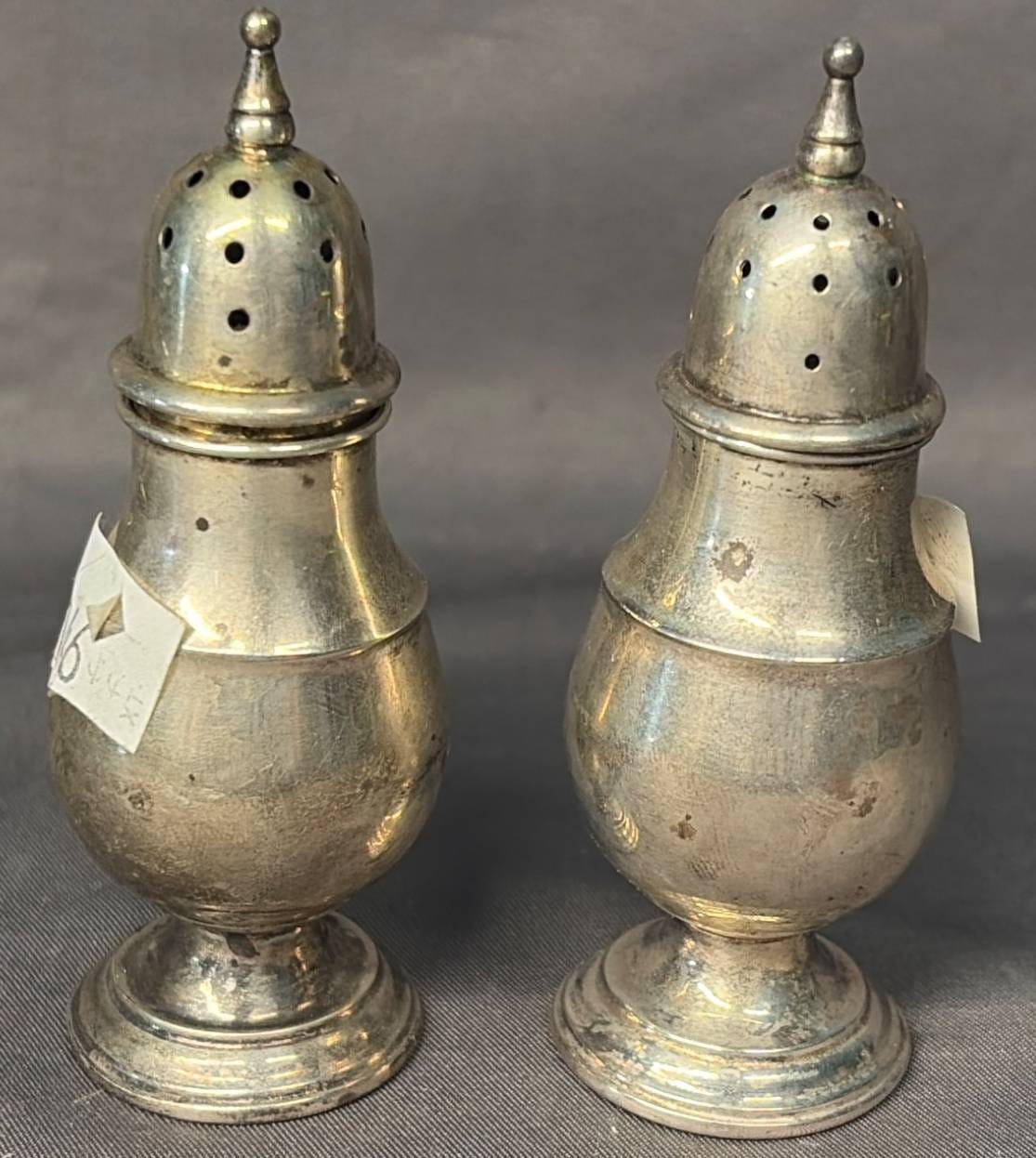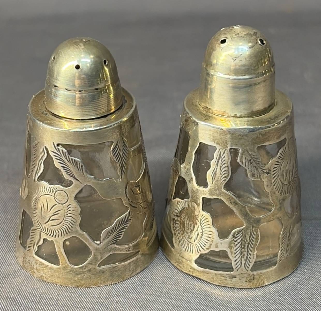2106 Sterling Overlay Salt and Pepper Shakers, 1.5” x 1.5” x 2”