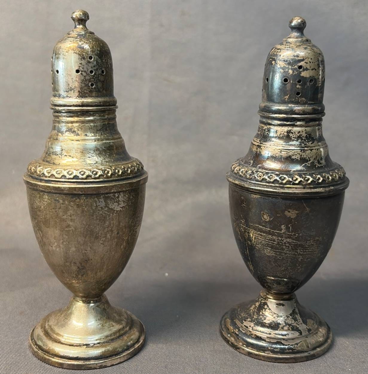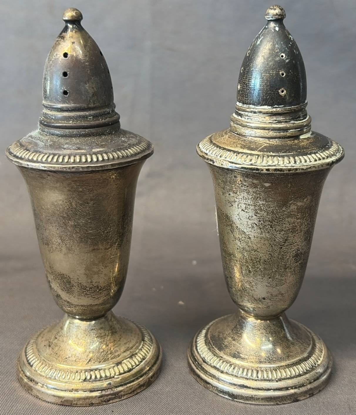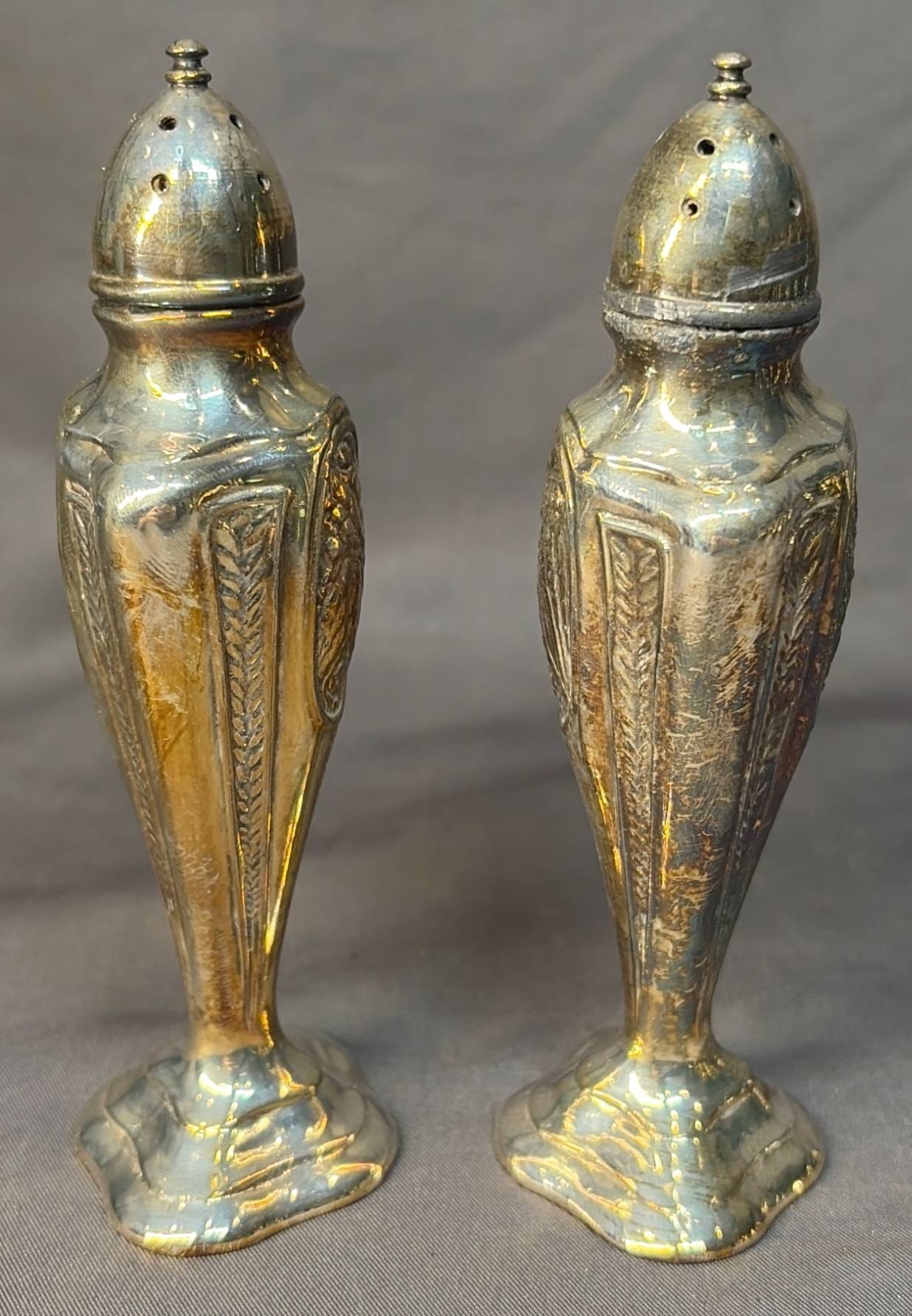 2106 Sterling Overlay Salt and Pepper Shakers, 1.5” x 1.5” x 2”
