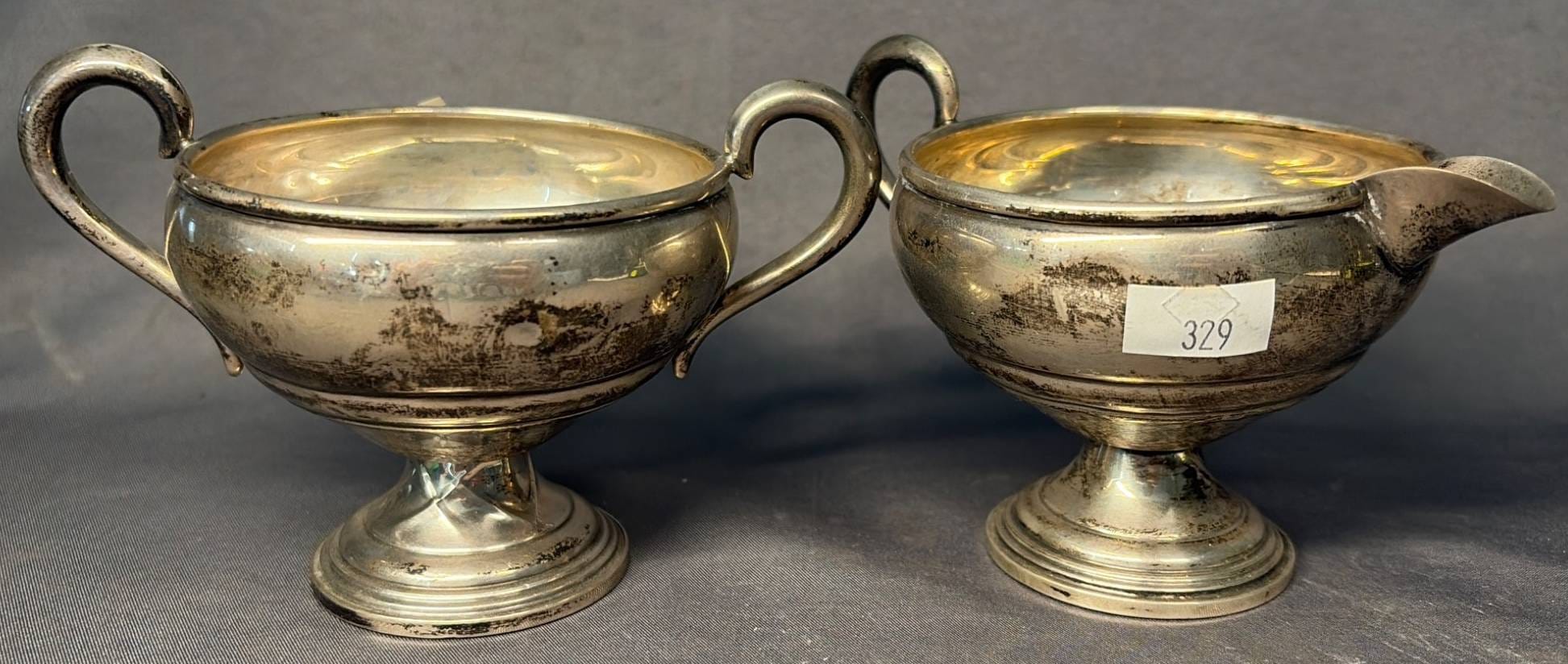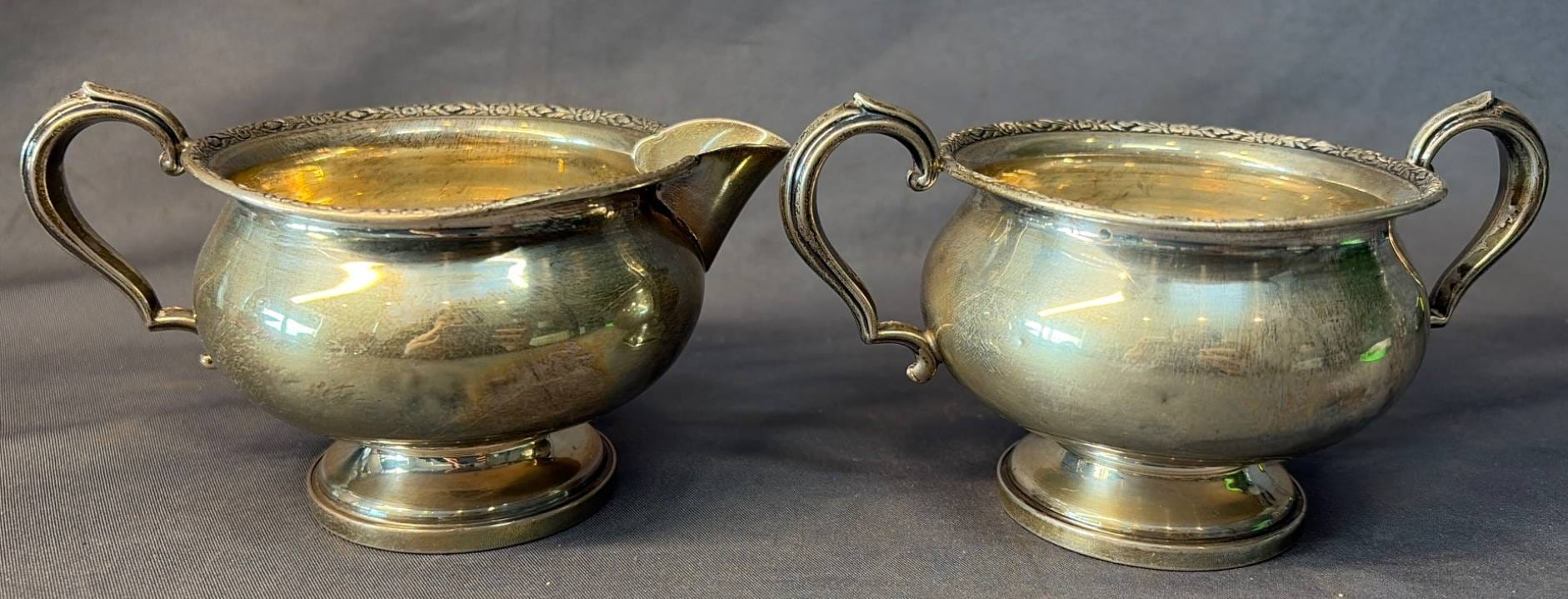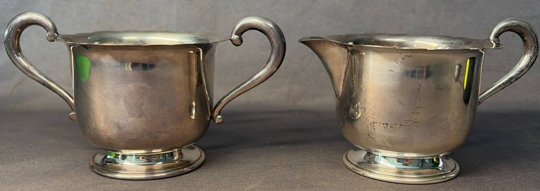 2104 Empire Sterling Weighted Creamer & Sugar Bowl, 4.5” x 3” x 3” & 5” x 3.5” x 3”