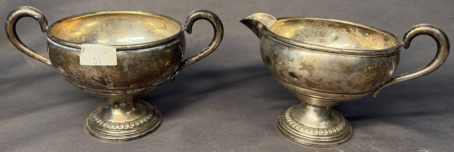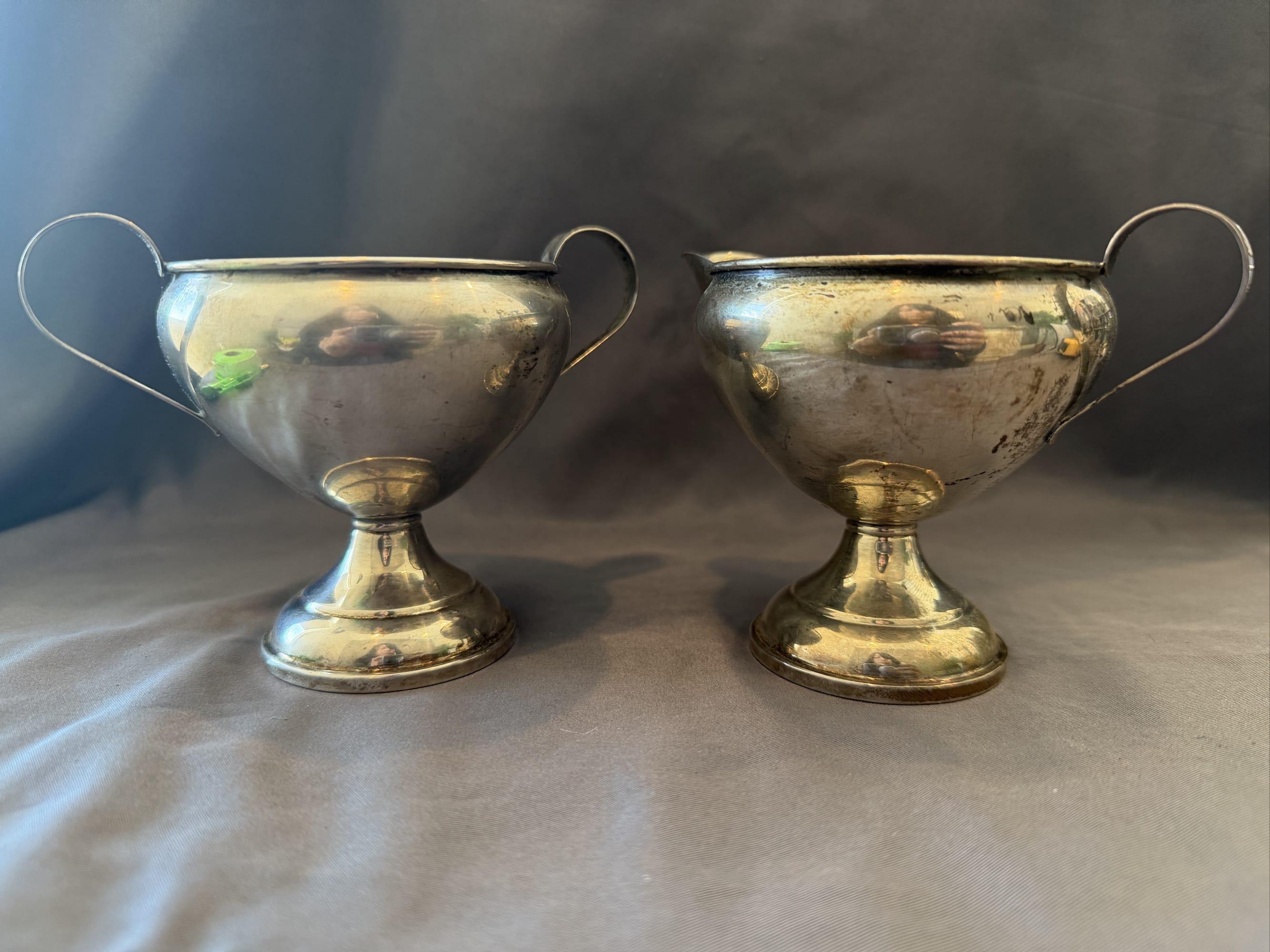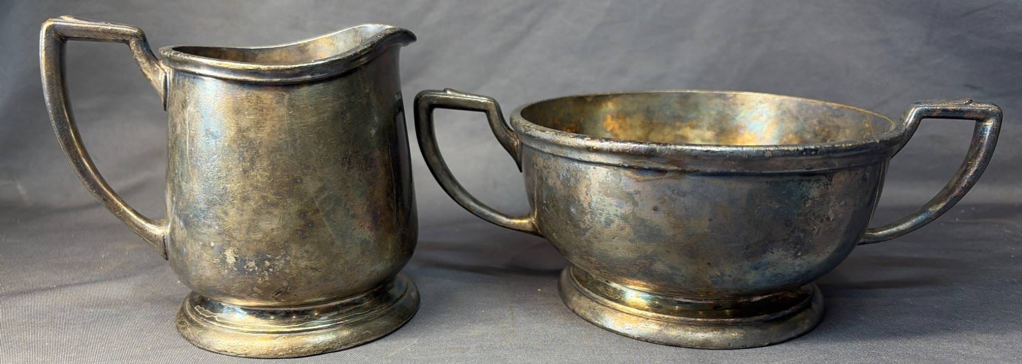 2104 Empire Sterling Weighted Creamer & Sugar Bowl, 4.5” x 3” x 3” & 5” x 3.5” x 3”