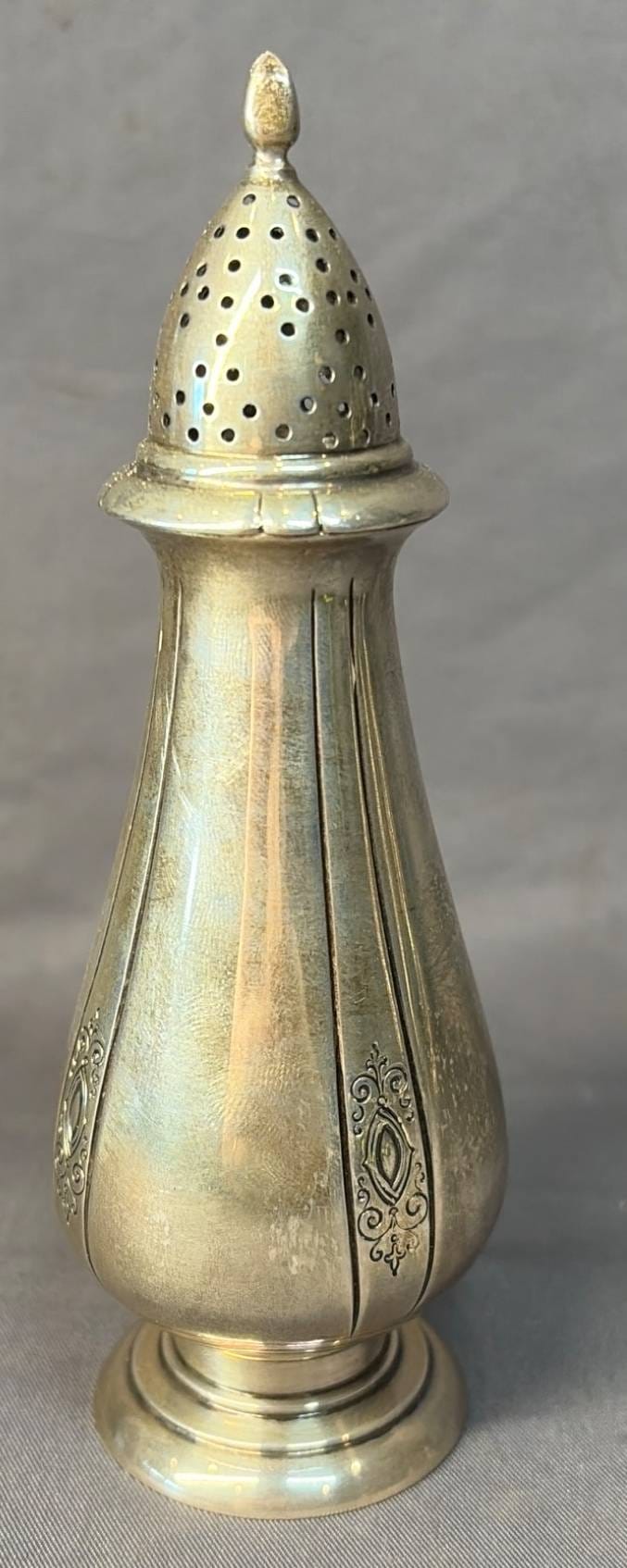 2022 Sterling Salt Shaker with Pierced Dome and Decorative Details, 1.5”x1.5”x5”, 90 Grams Total Weight