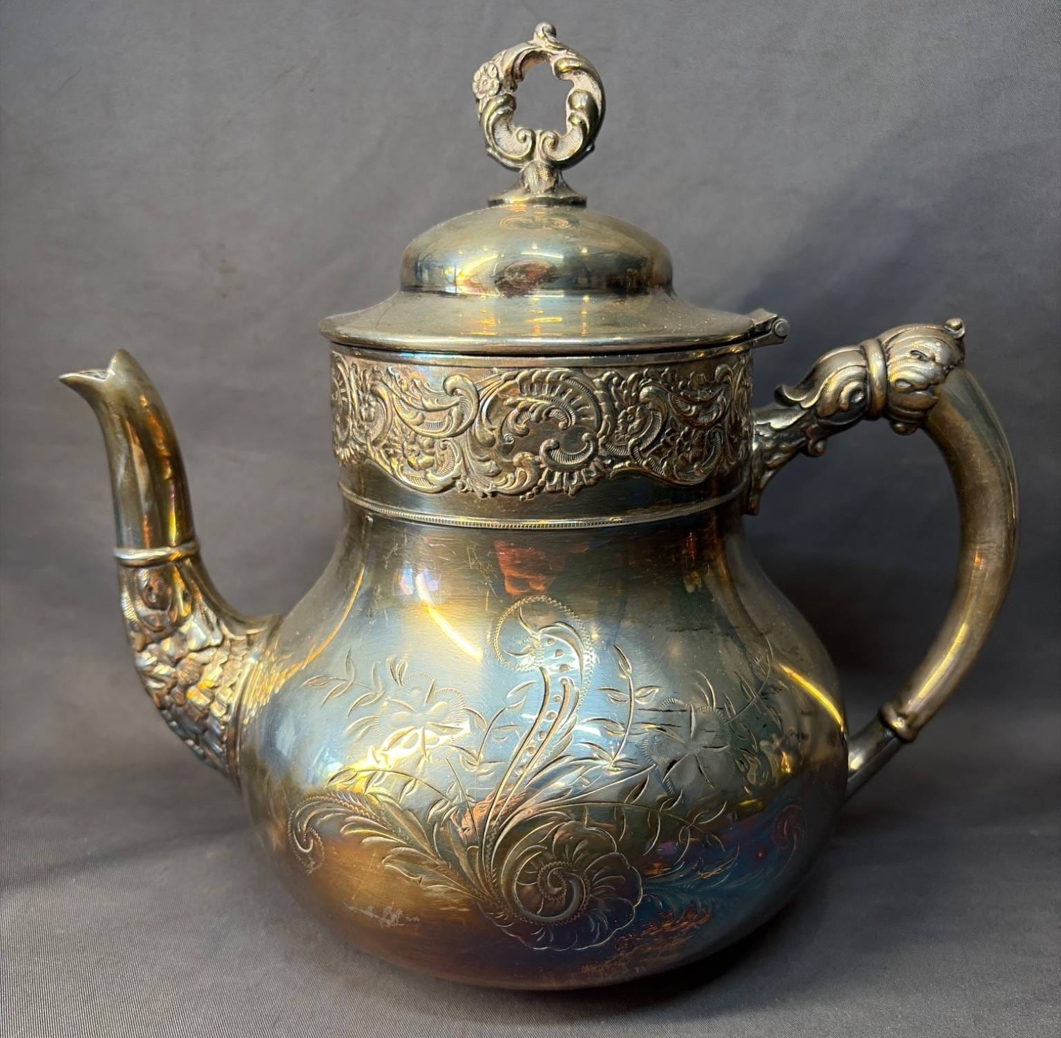 2025 Silver-Plated Teapot with Engraved Floral Motifs, 7” x 5” x 8”