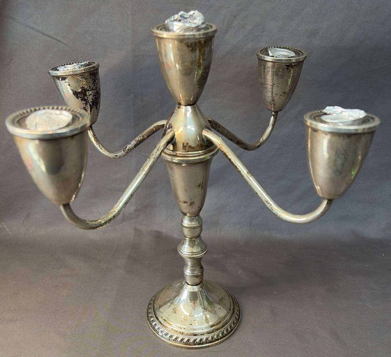 2029 BM Co. Sterling Weighted 3-Arm Candelabras, 7.5” x 3” x 6”