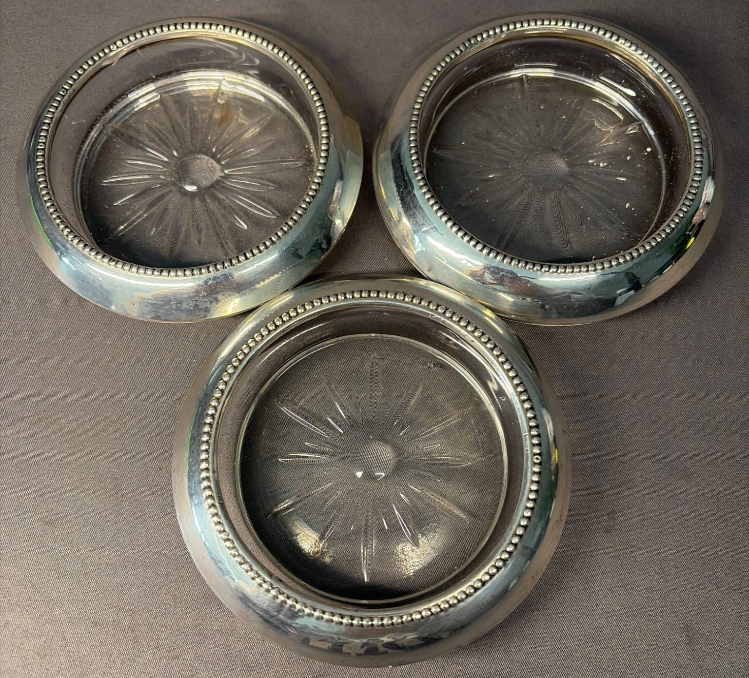 2098 3 BI Sterling Glass Coasters with Sterling Bases , 4” x 4”