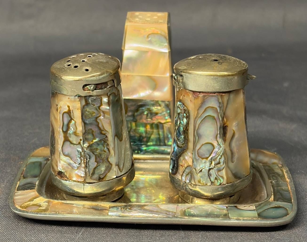 2107 Abalone Shell-Accented Salt and Pepper Shakers with Tray, 1” x 1” x 2” – 3.5” x 2.5”
