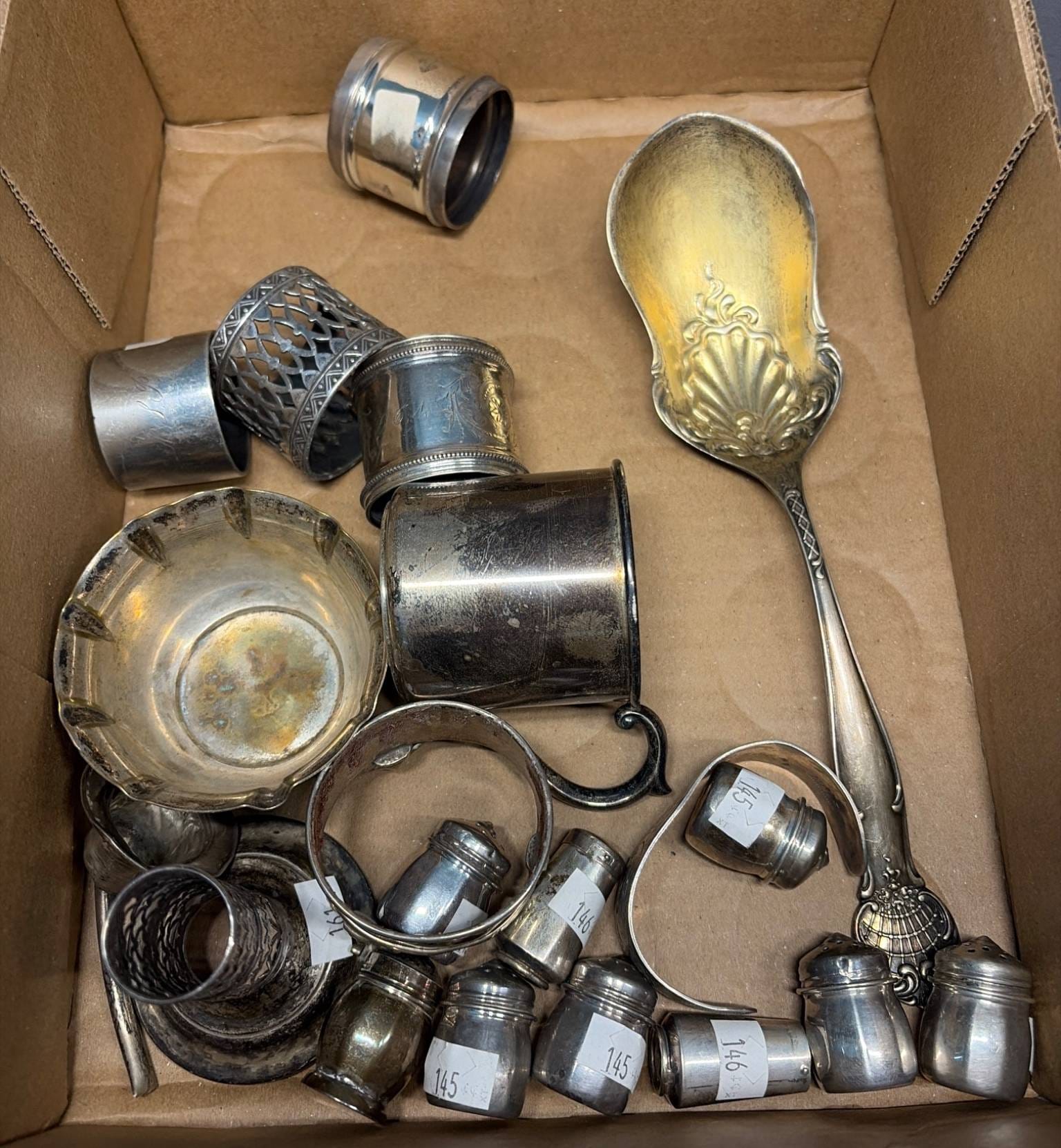 2143 Flatware, Shaker, Scrap Silver inc. Brazil Silver, Green Duck Co. Chicago - Total Weight 929 grams