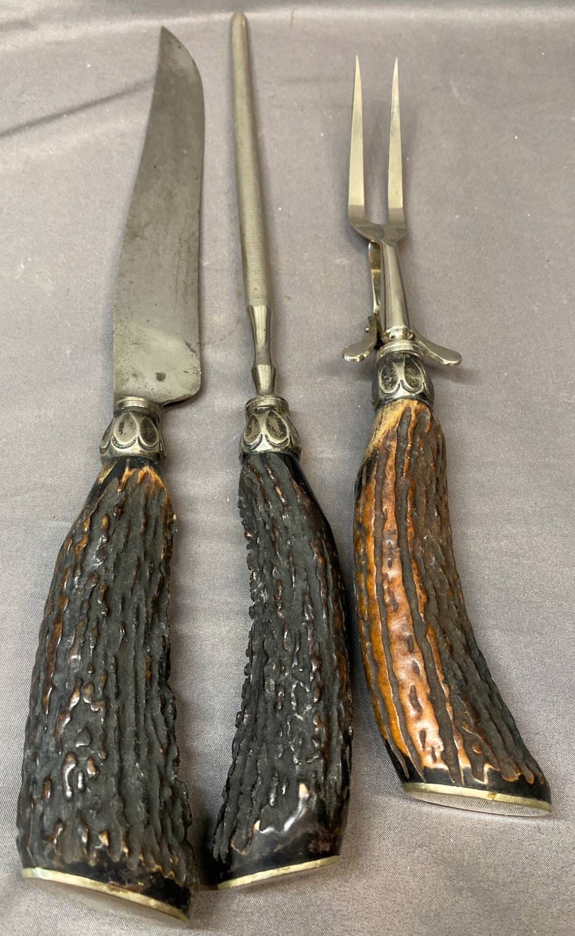 2128 Carving Utensils with Antler Handles and Unmarked Blades – Knife 224 g, Fork 218 g, and Sharpening Steel 232 g.