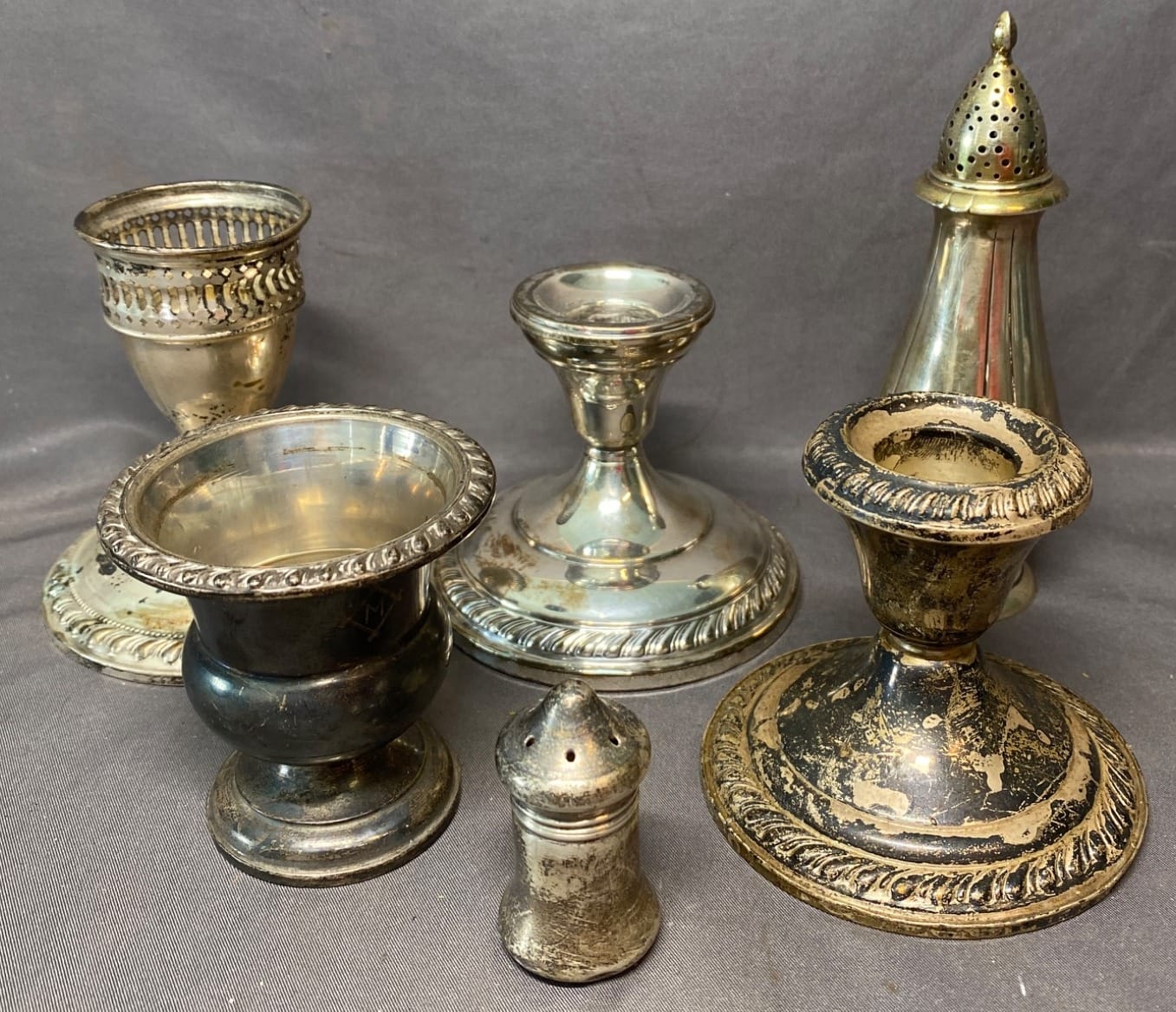 2147 Candlestick Holders, Shaker, Toothpick Holder inc. Sterling - Total Weight 795 grams