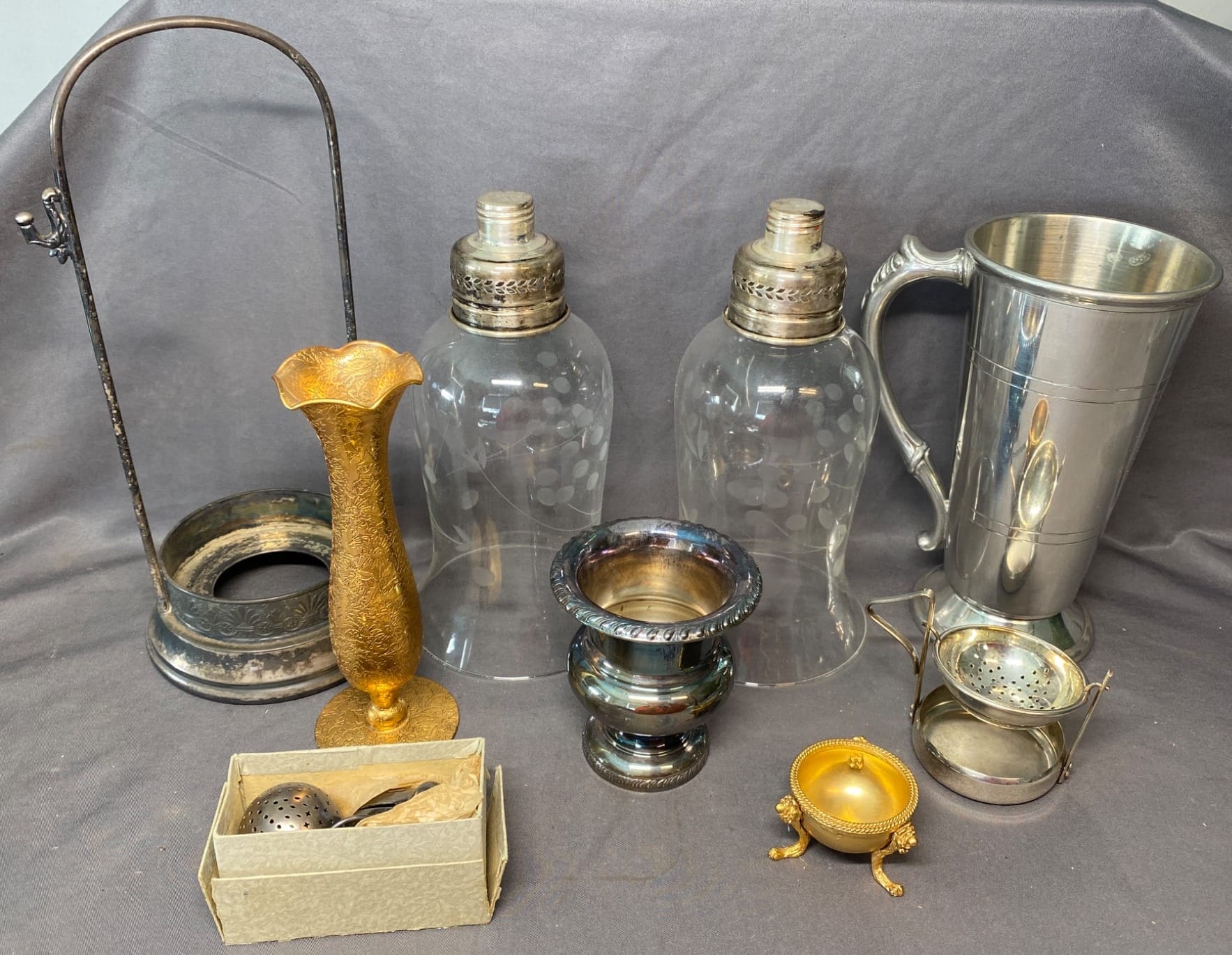 2148 Glass and Metal Homeware Inc. 22K Lotus Vase, Sterling Silver Cocktail Shakers and Sheffield Silver