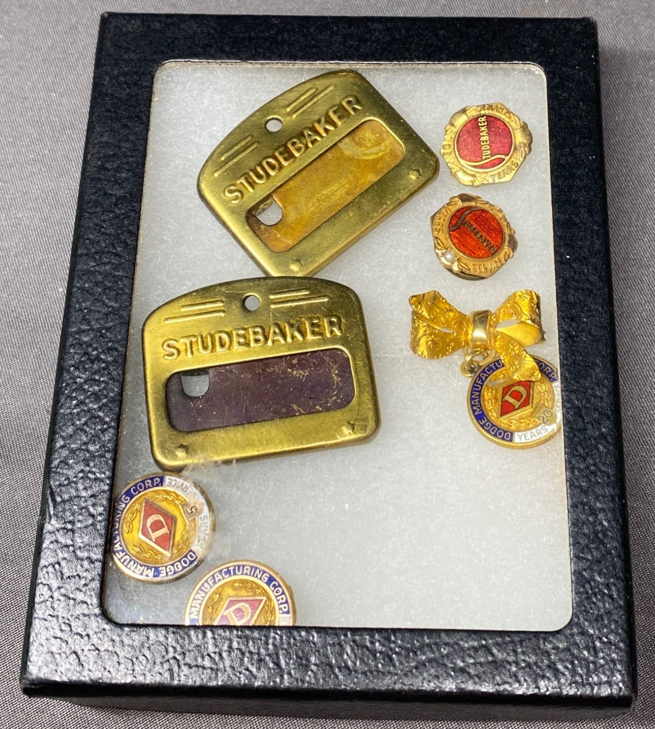 2182 Studebaker Brass Tags and Studebaker & Dodge Employee Service Pins in Display Box
