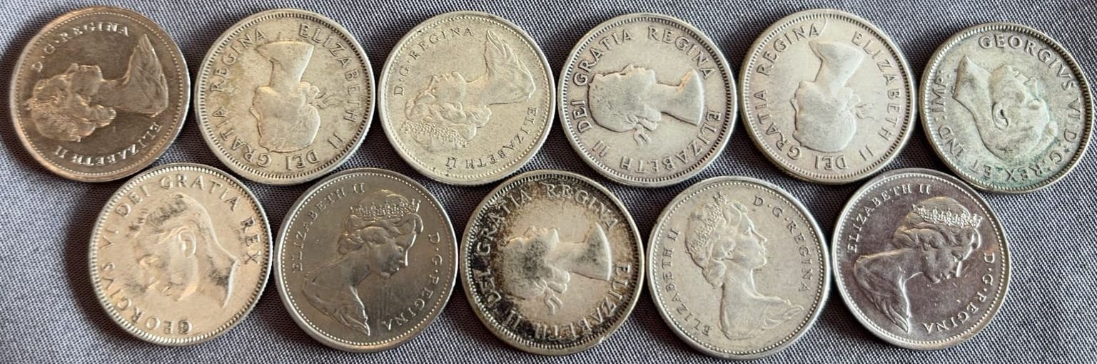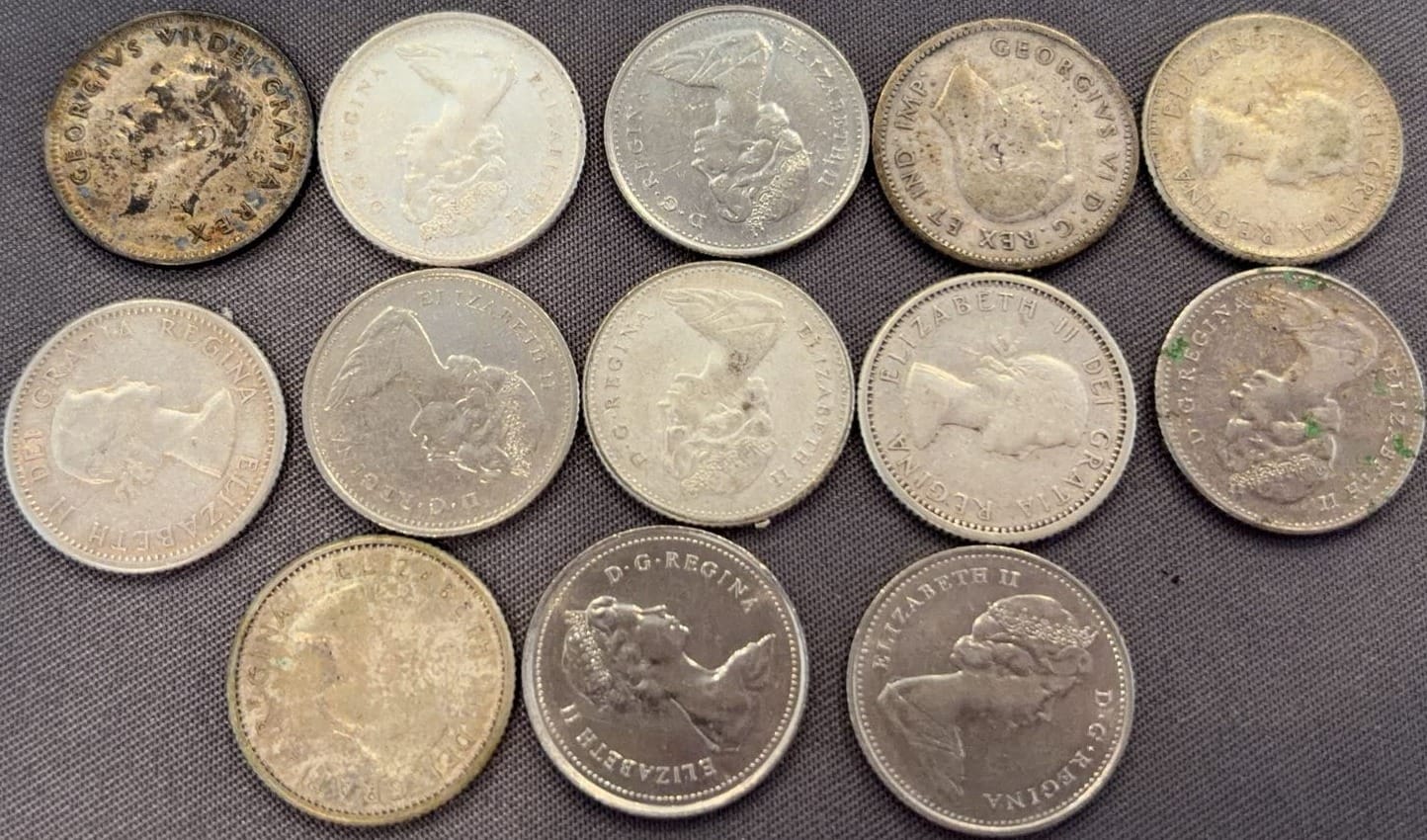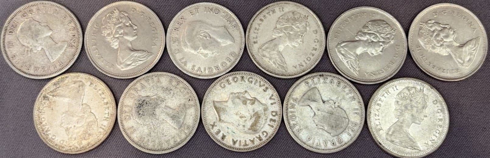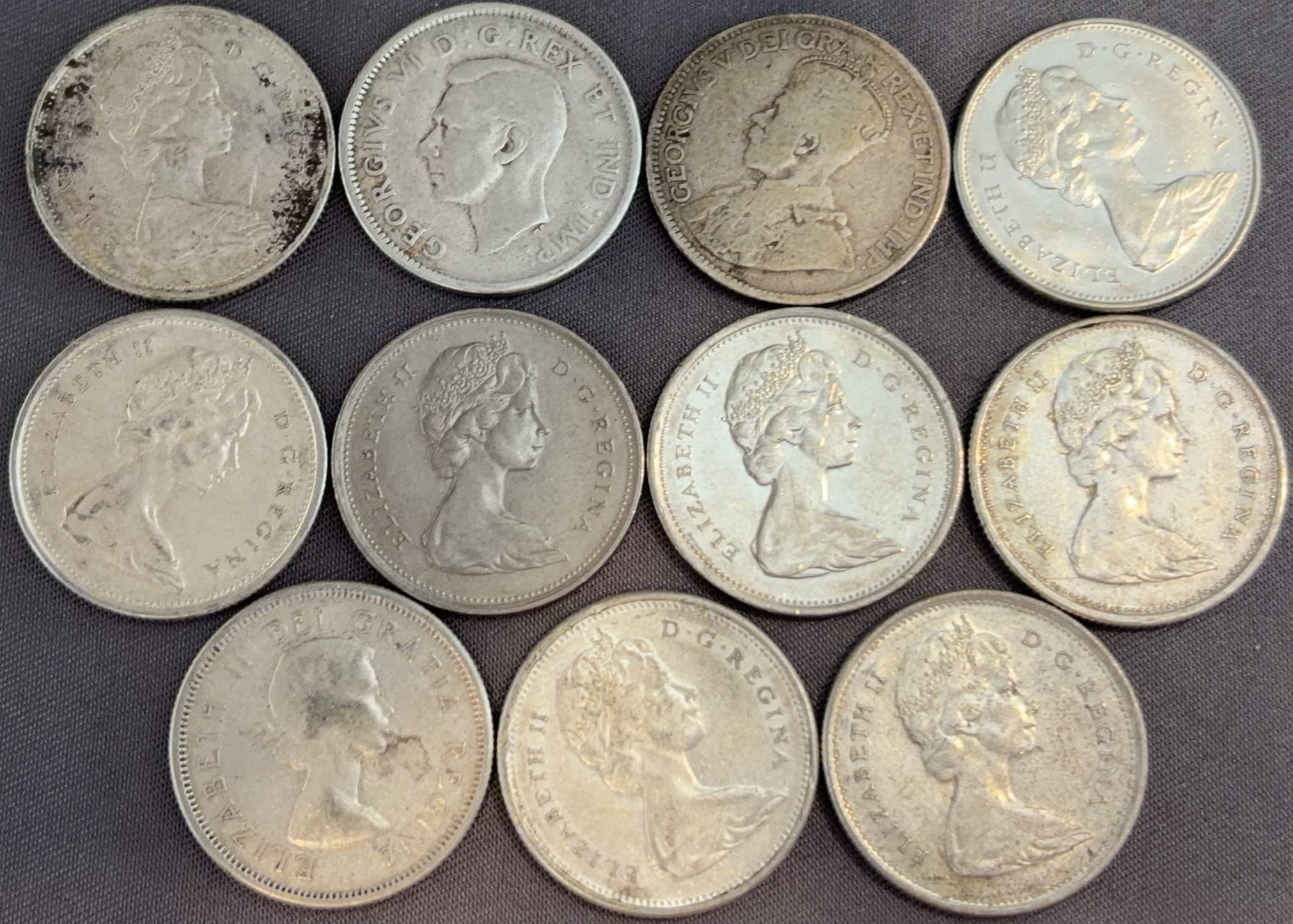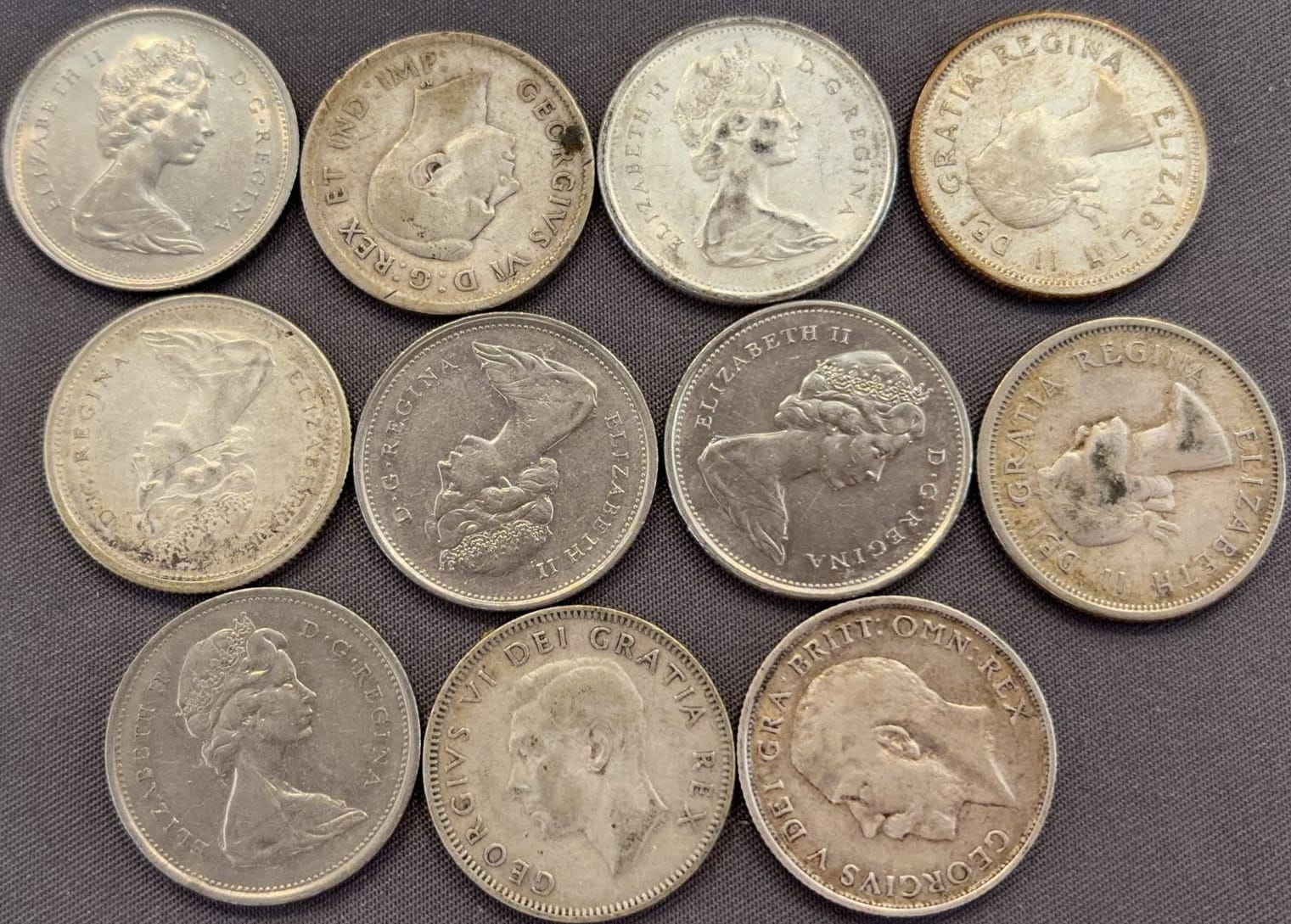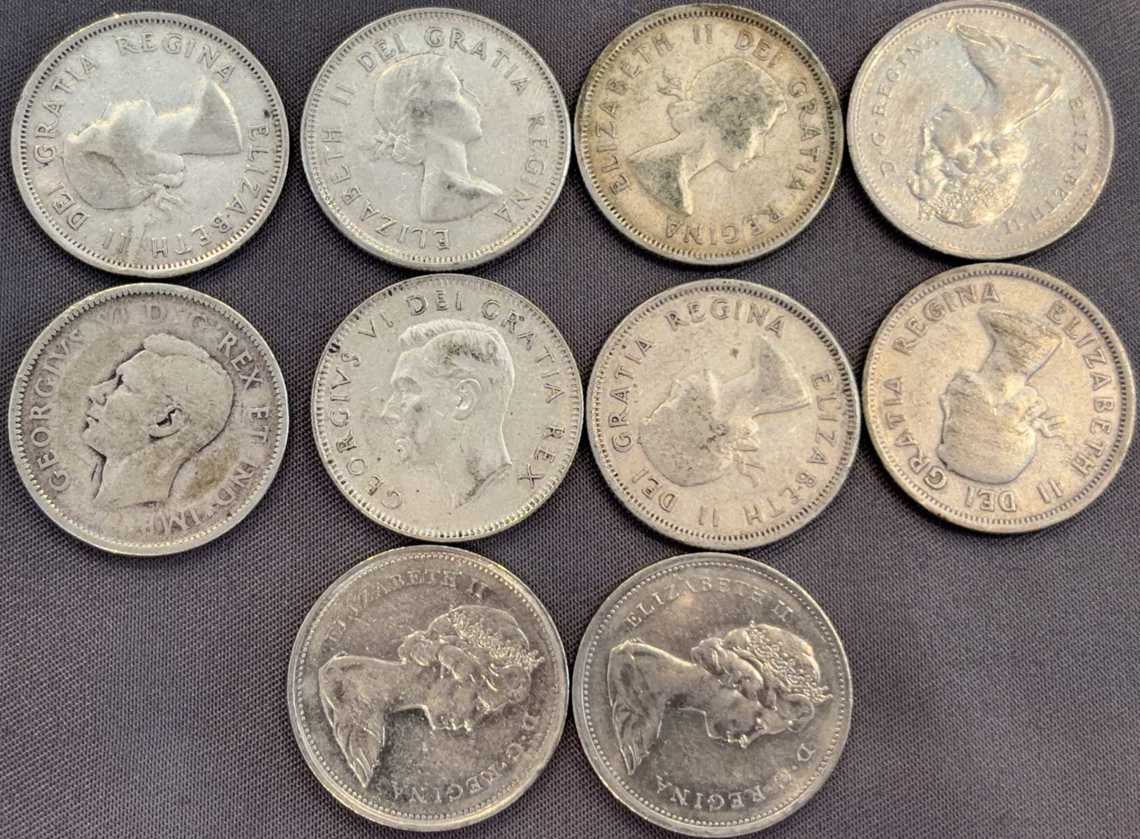 6588 (10) Canadian Quarters 1940-1975 George VI & Elizabeth II & (1) 1914 Great Britain George V One Shilling