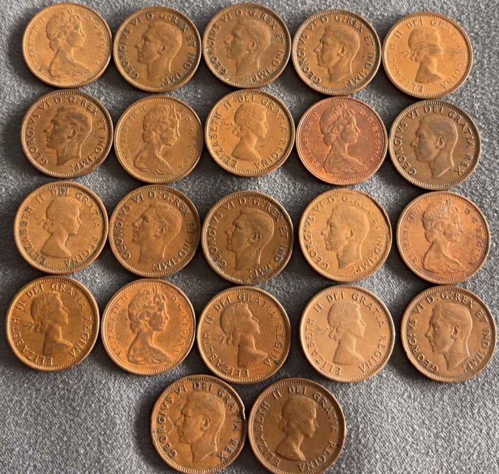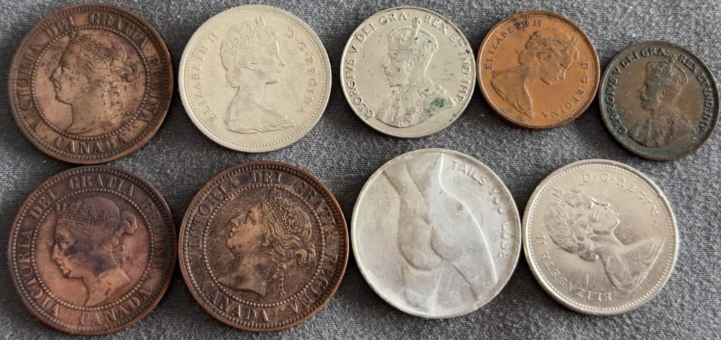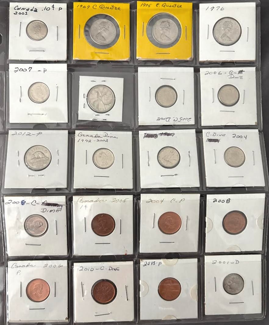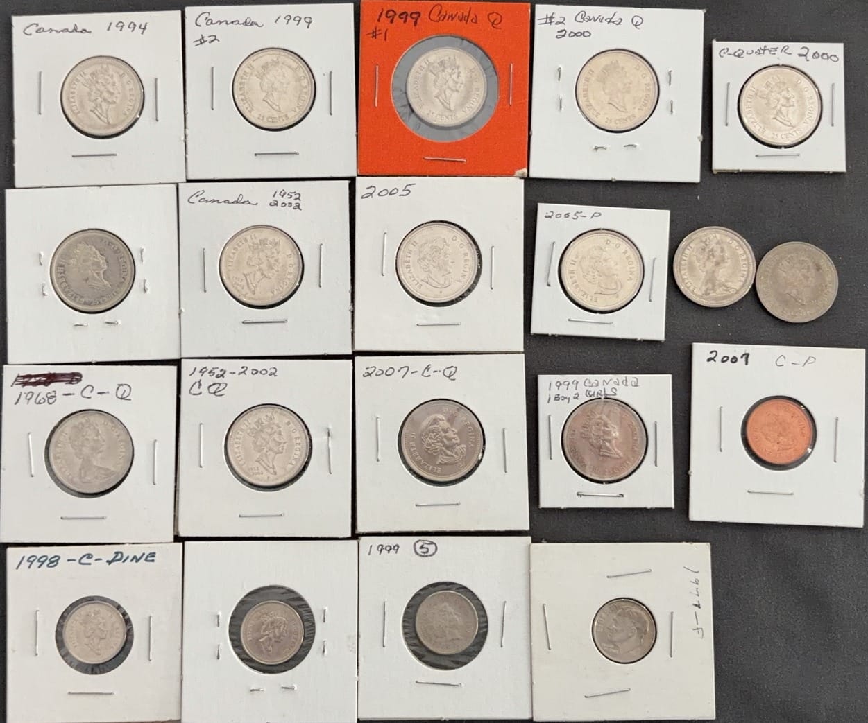 7140 Canadian Coin Assortment inc. (7) Canada Ten Cents 1952-1974, (11) Canada Five Cents 1938-1977, (14) Canada Pennies 1942-1979