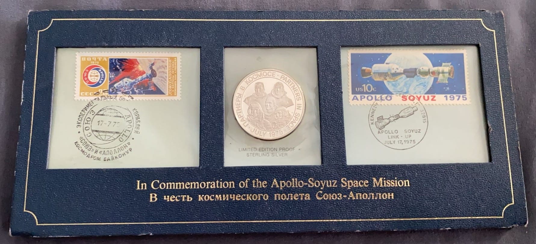 7204 Franklin Mint 1975 Commemoration Apollo-Soyuz Space Mission Set w/ Sterling Silver Proof Medal and Stamps