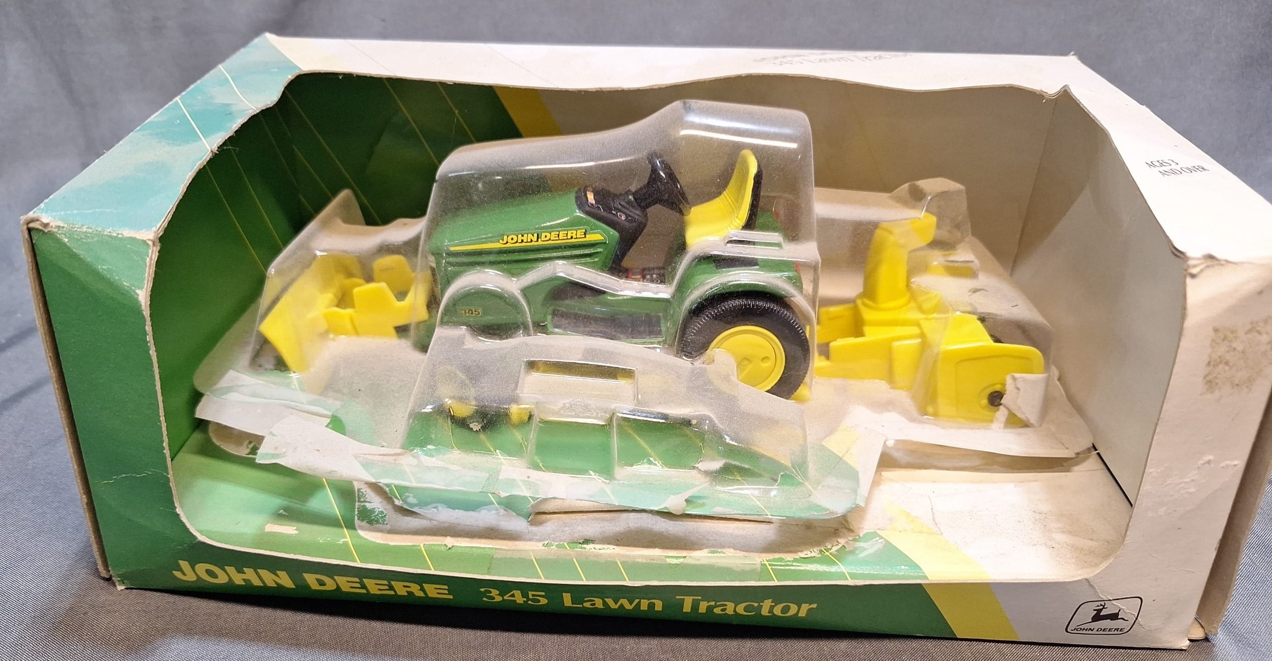 15 John Deere 345 lawn tractor set, plastic on packaging is loose and taped, 1/16 scale