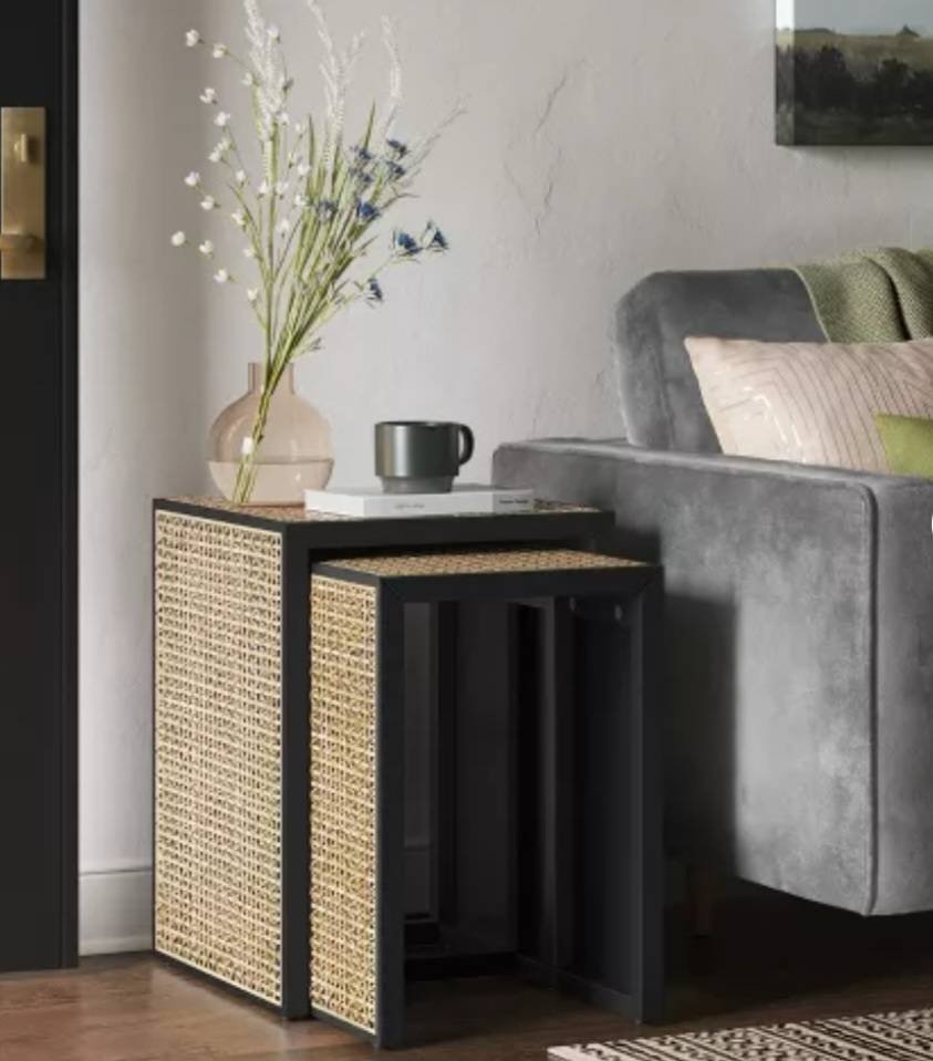 107 Threshold-brand nesting accent tables featuring black frames and natural cane panels. Includes 2 tables measuring 18? x 18? x 24? and 15? x 15? x 22?.