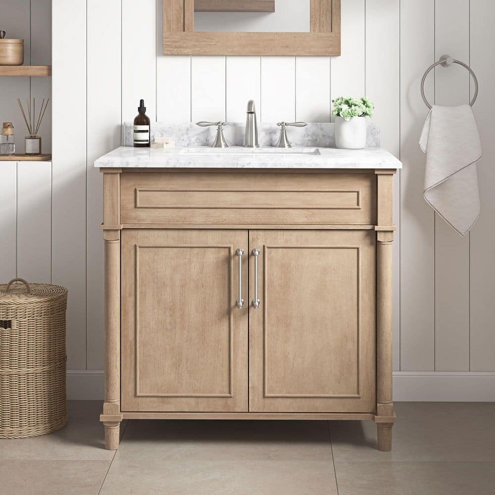 751006 HOME DECORATORS COLLECTION - Aberdeen 36 in. Single Sink Antique Oak Bath Vanity with Carrara Marble Top (Assembled)