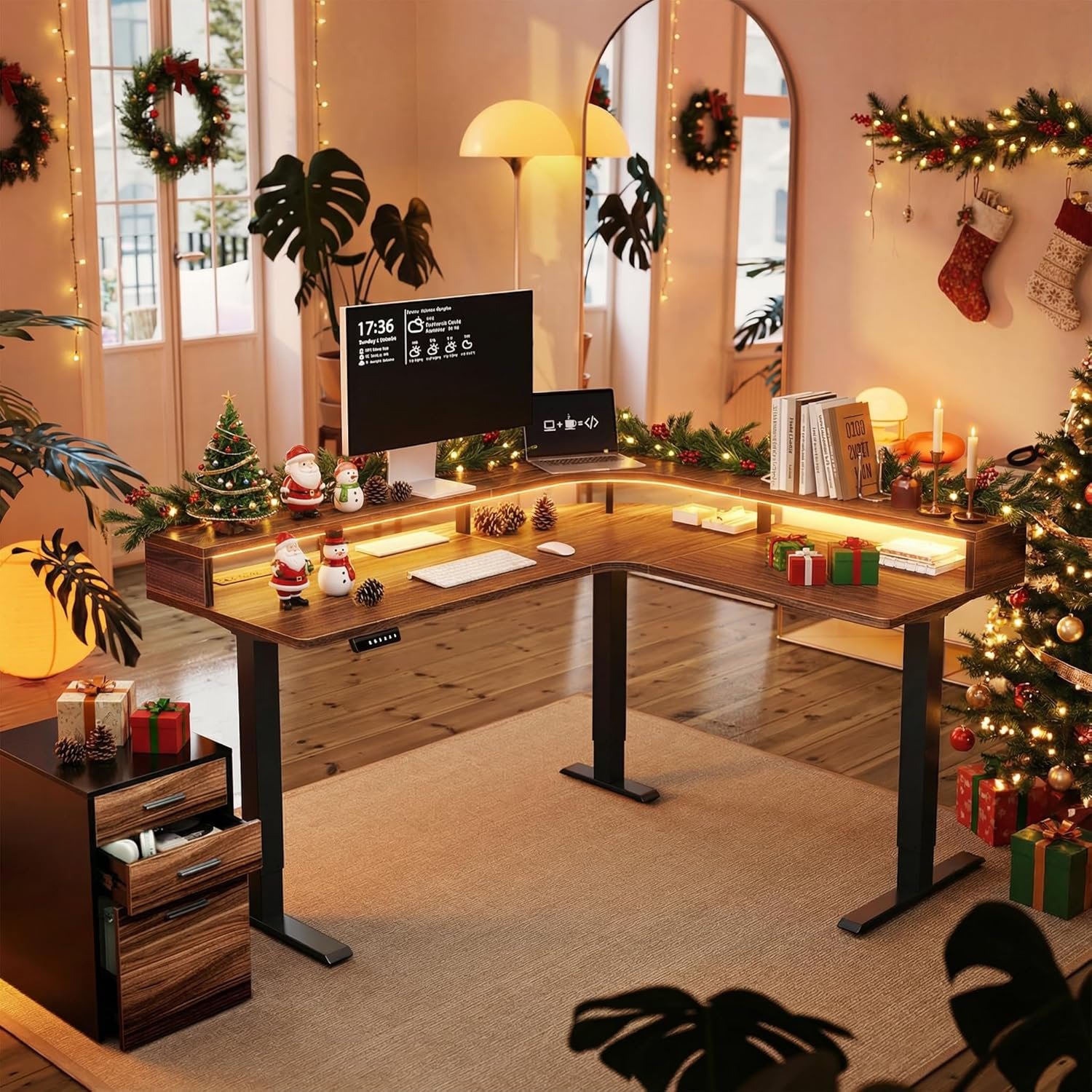751061 HUUGER - Electric L Shaped Stadning Desk with LED Strip & Power Outrlets 2-Tier Height Adjustable Sit Stand up Desk with Power