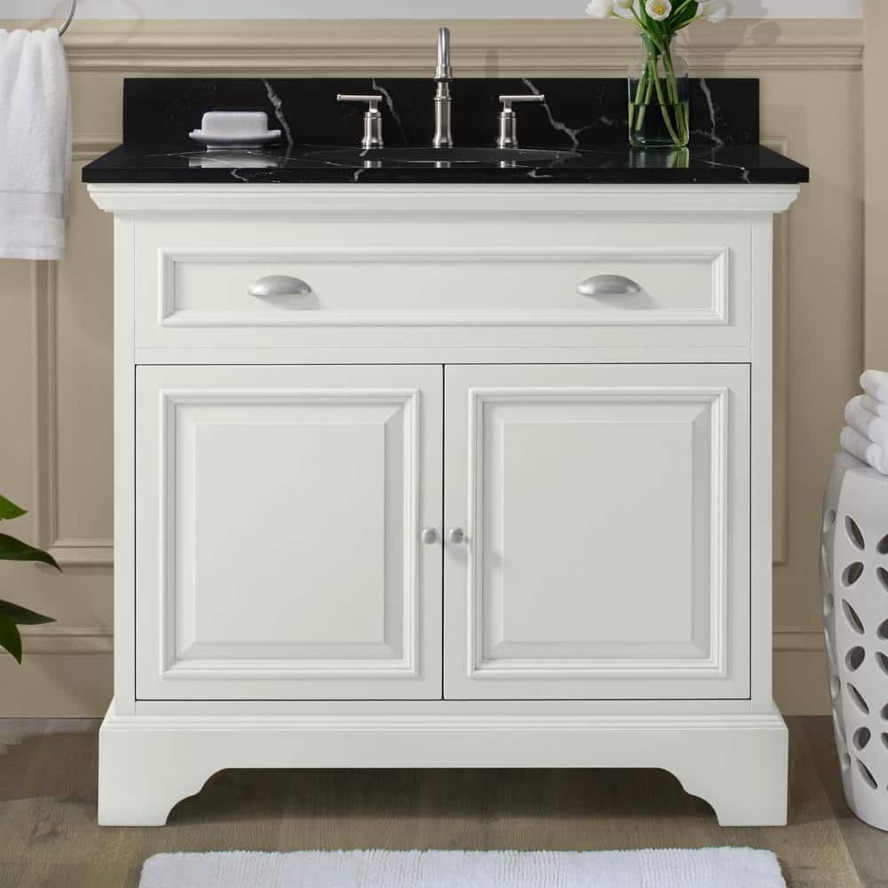 811012 HOME DECORATORS COLLECTION - Sadie 38 in. Single Sink Matte Pearl Bath Vanity with Black Marquina Quartz Top (Assembled) - SEE PRODUCT DETAILS
