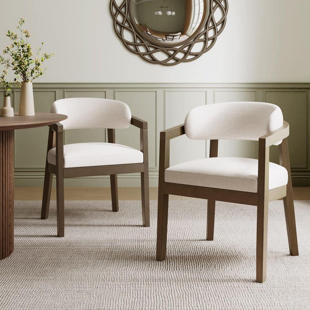 821040 " CHRISTOPHER KNIGHT HOME - Candice Walnut Plus Beige Modern Solid Wood Upholstered Dining Chairs with Curved Backrest and Armrests (Set of 2)