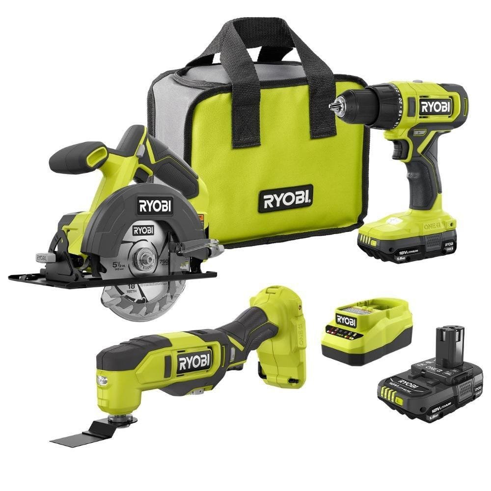 821085 RYOBI - ONE 18V Cordless 2 Tool Combo Kit w/ Drill/Driver, Circular Saw, Multi Tool, 2 1.5 Ah Batteries, & Charger