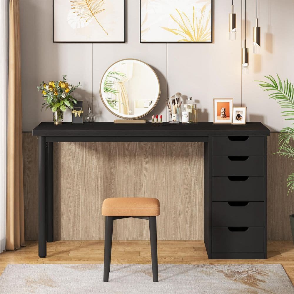 821087 FUFU&GAGA - 55.9 in. L Shaped Black Wood Computer Desk with 5-Shelves Drawer and Cabinet Writing Table Workstation Reception Desk