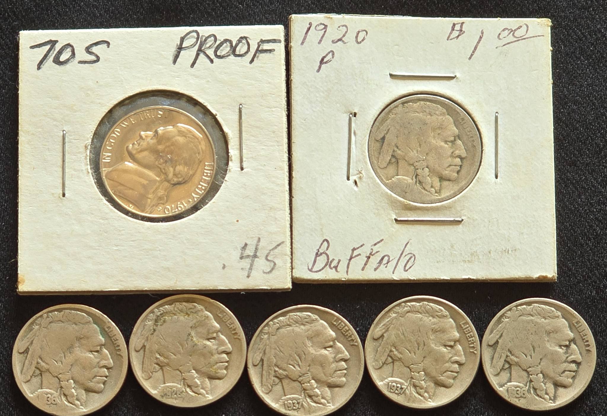 16 6 Buffalo Nickels 1920-1937 & 1 - 1970-S Jefferson Nickel Proof