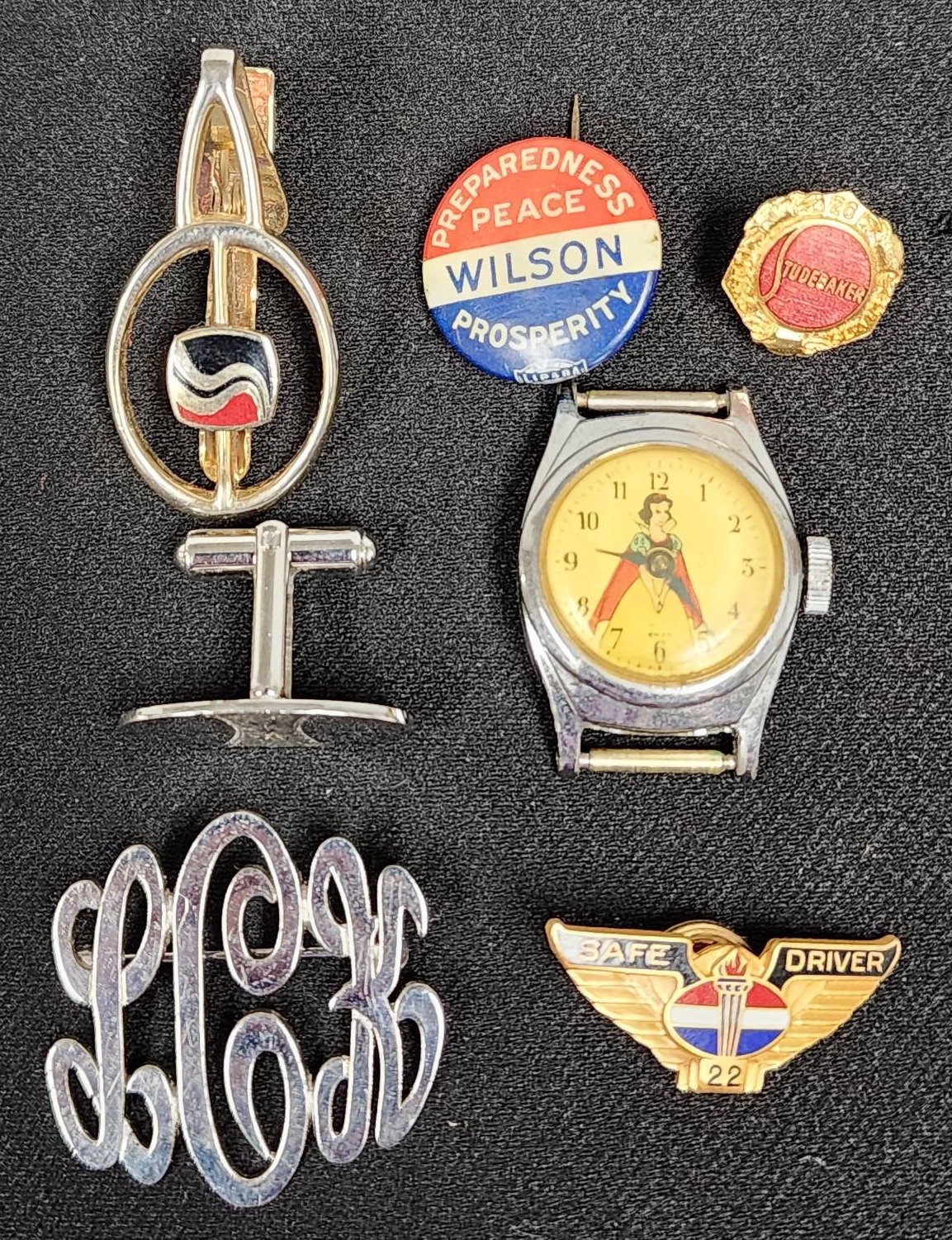 301 Pins Inc. Wilson Prosperity, Studebaker, Safe Driver, Sterling & Snow White Watch Face by U.S. Time Inc.
