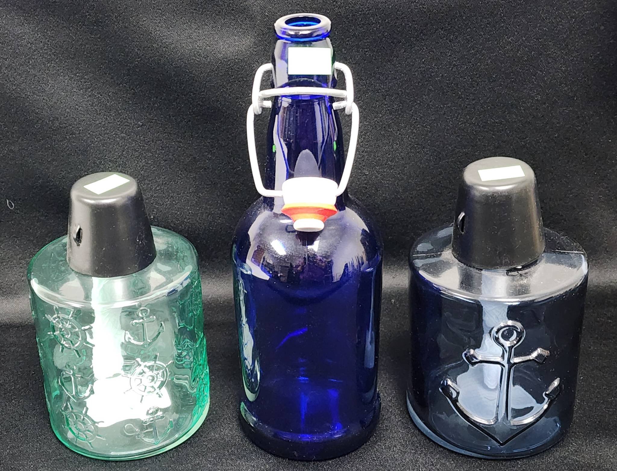 505 Blue Flip-Top Bottle and 2 Anchor Motif Glass Tiki Lanterns, 6-8"
