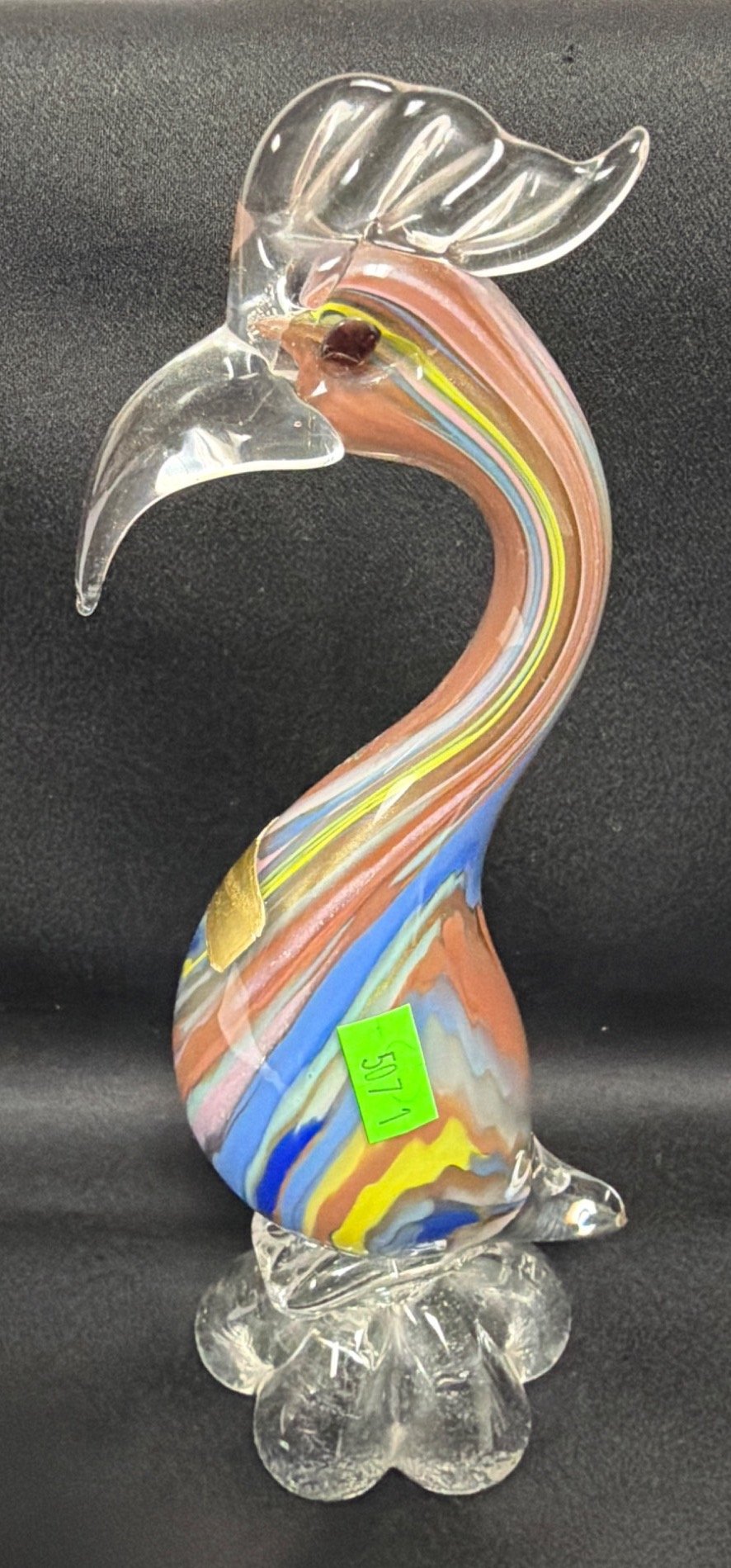 507 Murano Style Blown Glass Bird Figurine with Multicolor Swirl Design, 8"