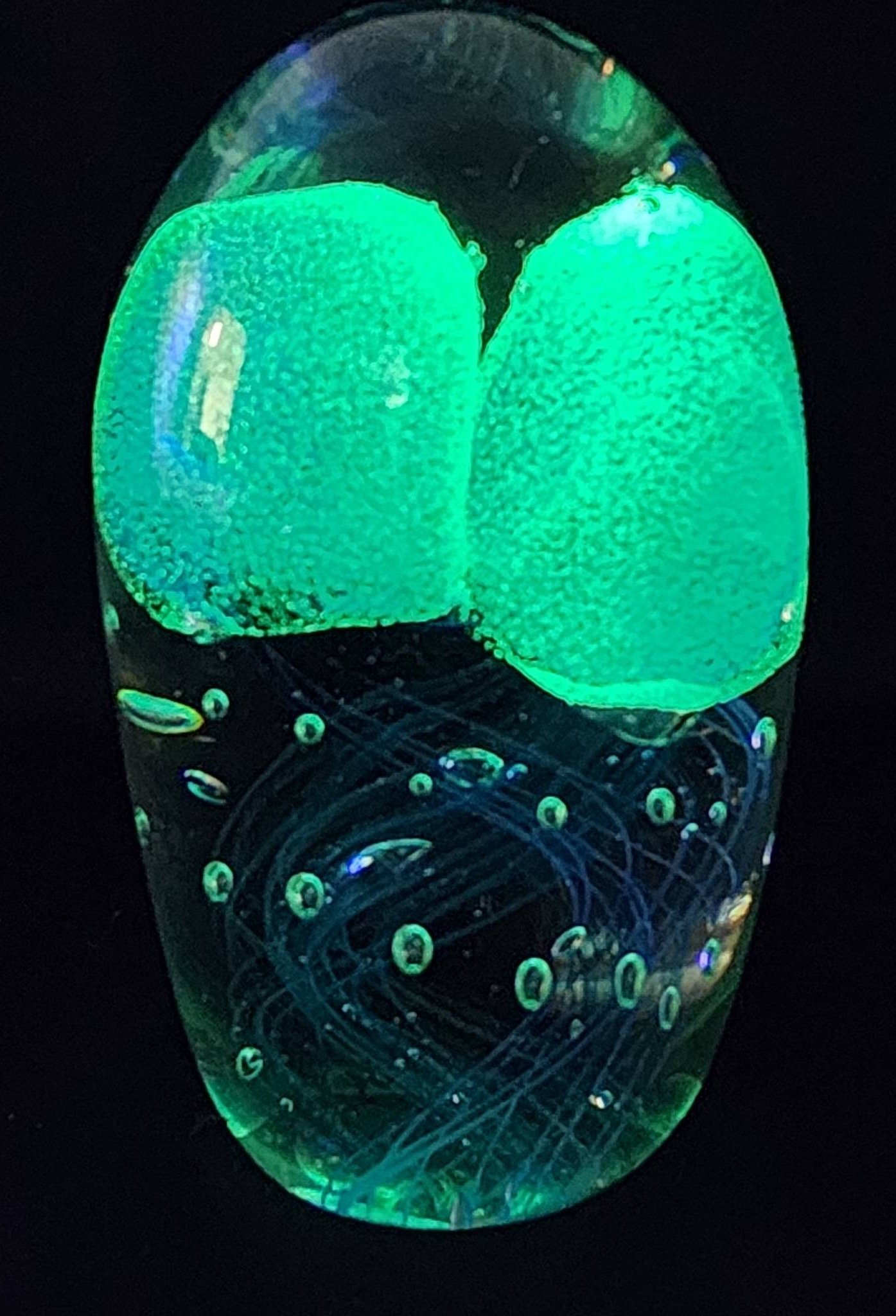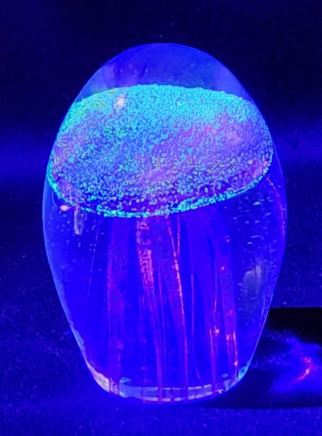 510 Glow-in-the-Dark Glass Paperweight with Integrated Blue Swirls and Bubble Accents, 5.5"