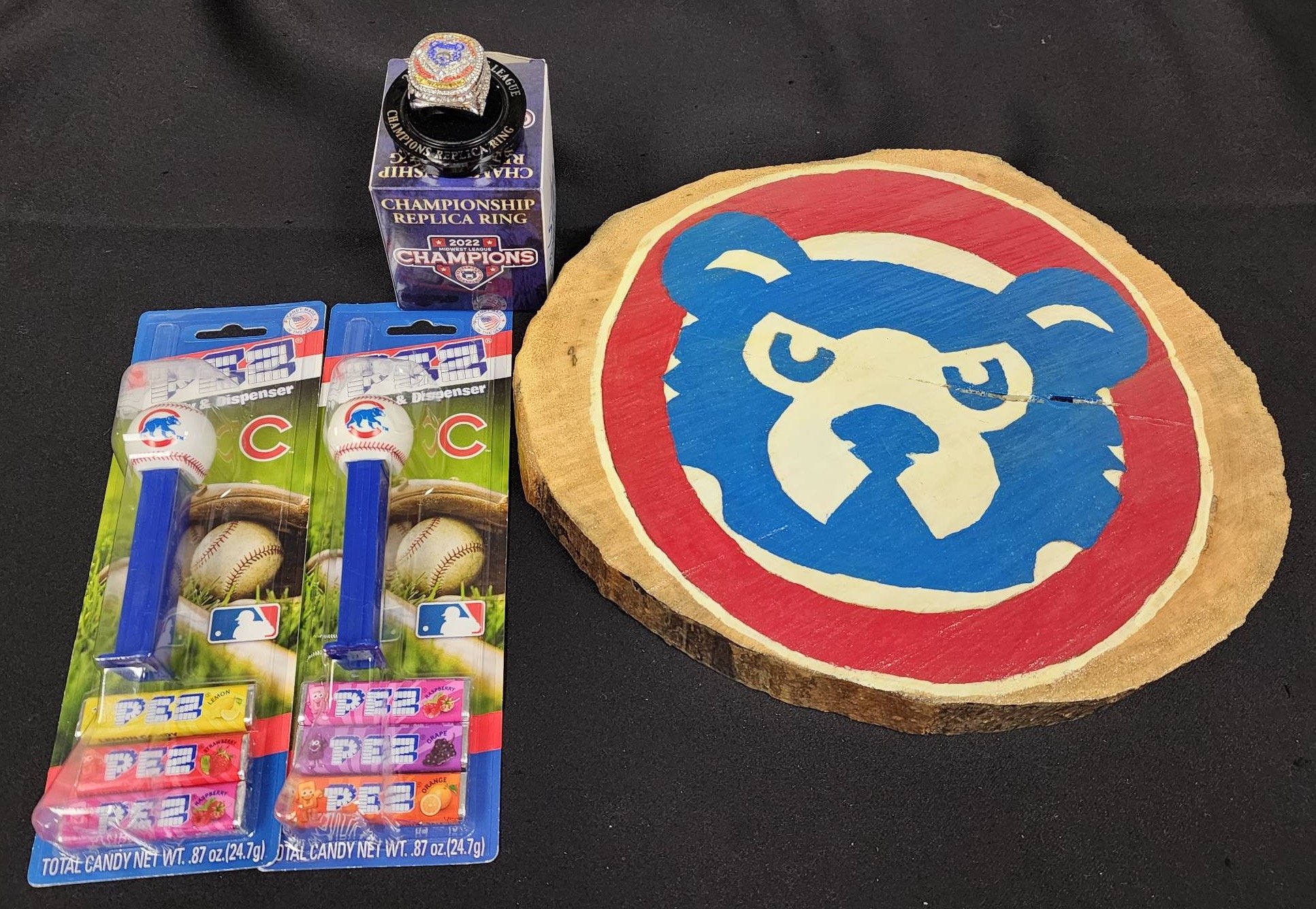 520 2022 Midwest League Championship Replica Ring, 2 Chicago Cubs Pez Packs, Chicago Cubs Wood Plaque
