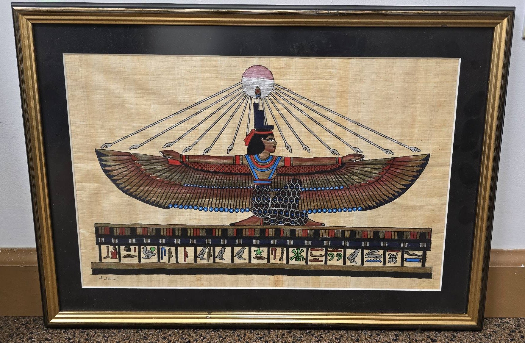 604 Egyptian Framed Papyrus Artwork with Depiction of Goddess Isis with Her Wings Outstretched 19?x13.5?