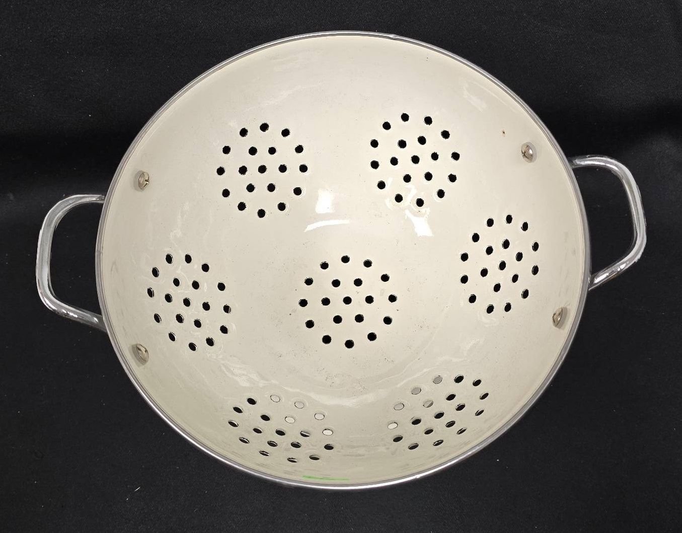 704 Enamel Colander with Handle and Painted Landscape Design 9? Dia