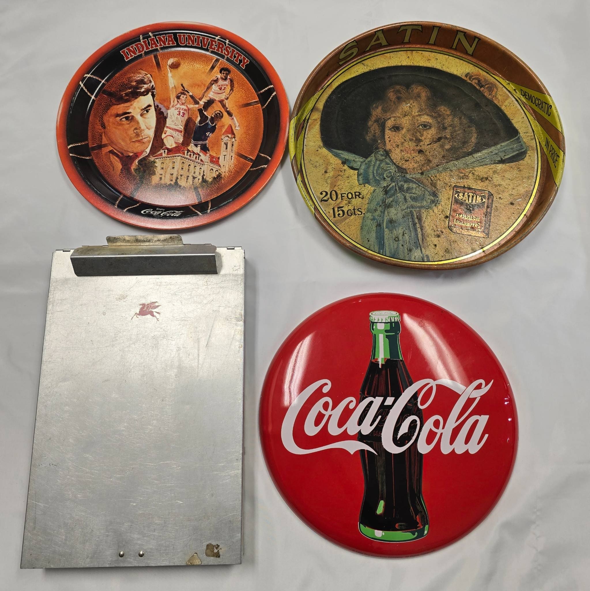 737 Clipboard, Coca-Cola Button Sign & 2 Advertising Trays inc. Indiana University Coca-Cola & Satin Cigarettes