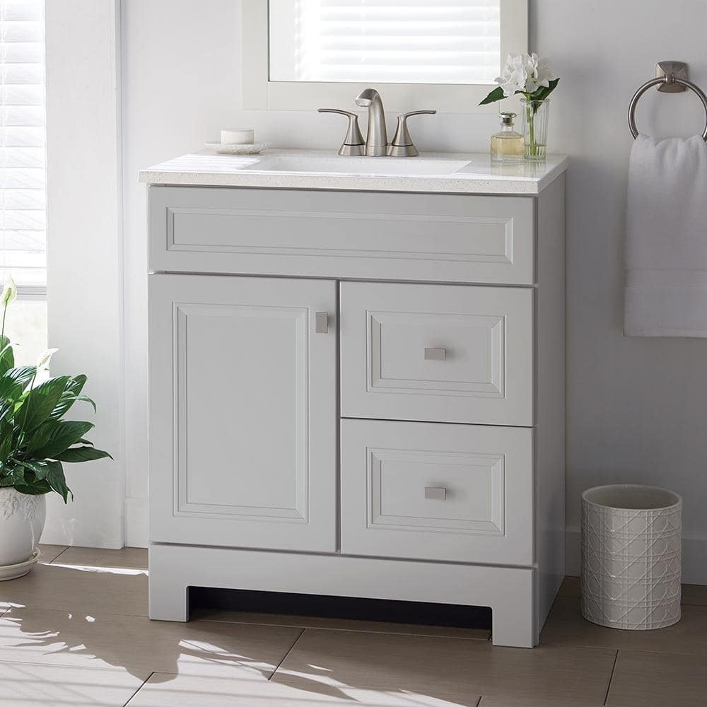 831018 HOME DECORATORS COLLECTION - Sedgewood 30.5 in. W x 18.75 in. D x 34.375 in. H Single Sink Bath Vanity in Dove Gray with Arctic Solid Surface Top - SEE PRODUCT DETAILS