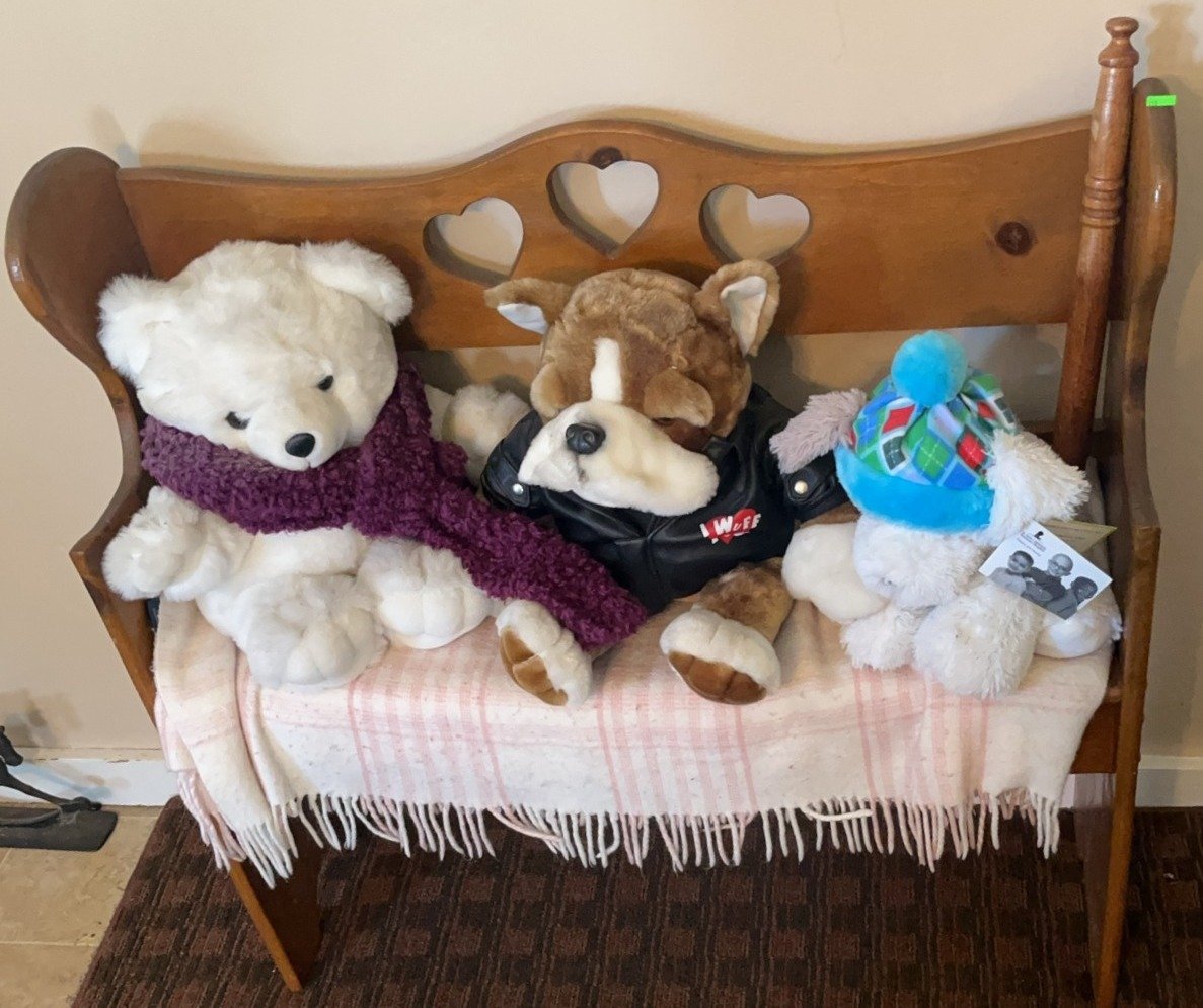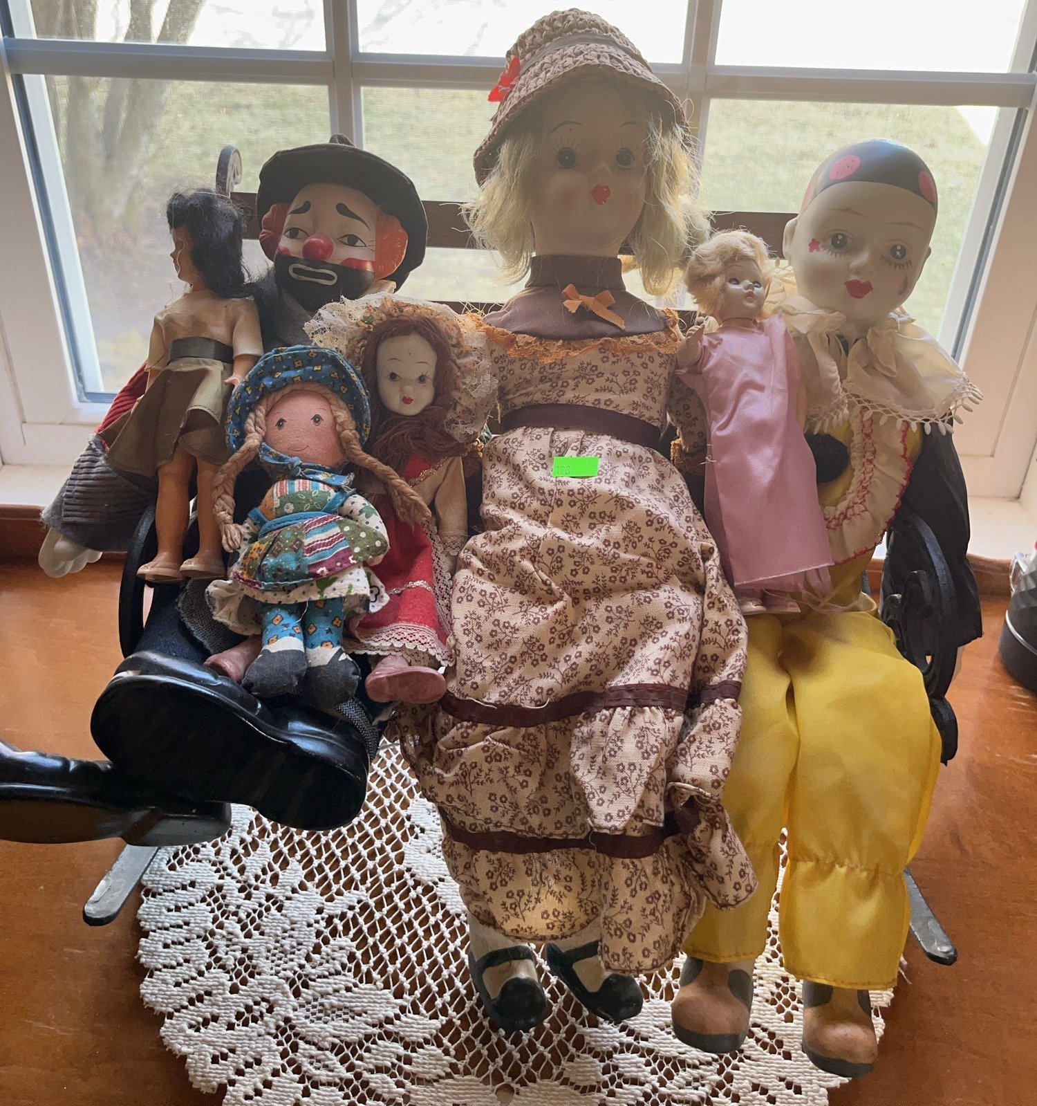 123 7 Dolls Including Porcelain Clown, Bench NOT Included