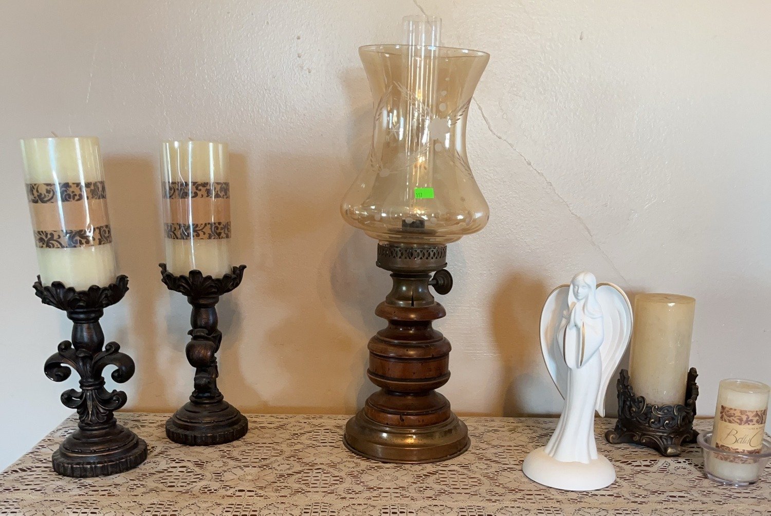 117 Electric lamp, 4 candlesticks with holders and an angel