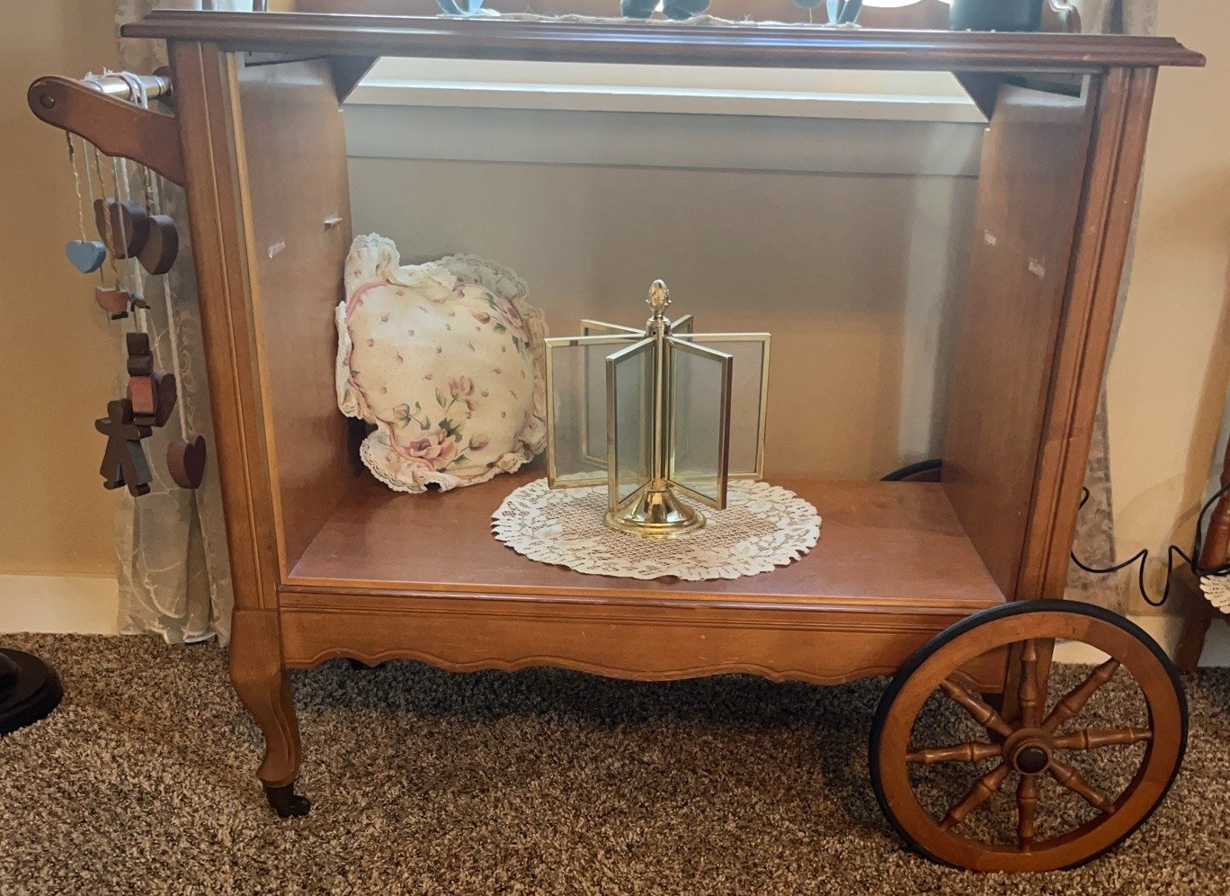 124 Wood Tea cart with contents Inc. Picture Frames, Doily and Decorative Pillow