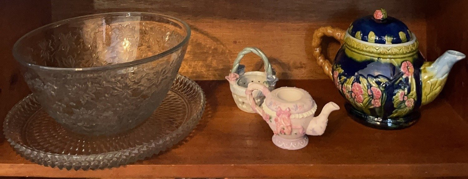 128 Pressed Glass Bowl and Tray, 2 Decorative Tea Pots and Decorative Basket