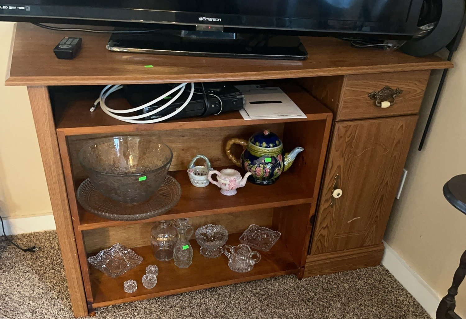 125 Wood telephone table features a spindle-leg design with a lower shelf for storage, Candle Warmer, blue glass bowl and plate, & a lace doily