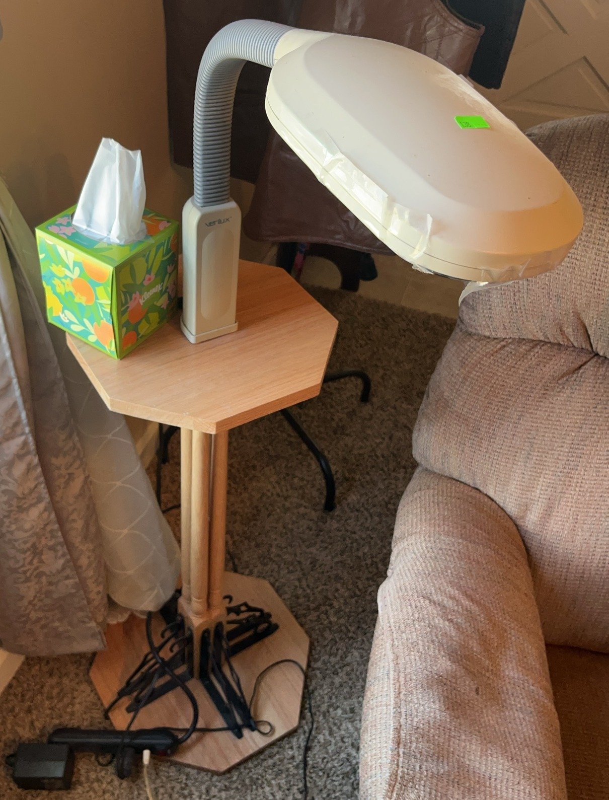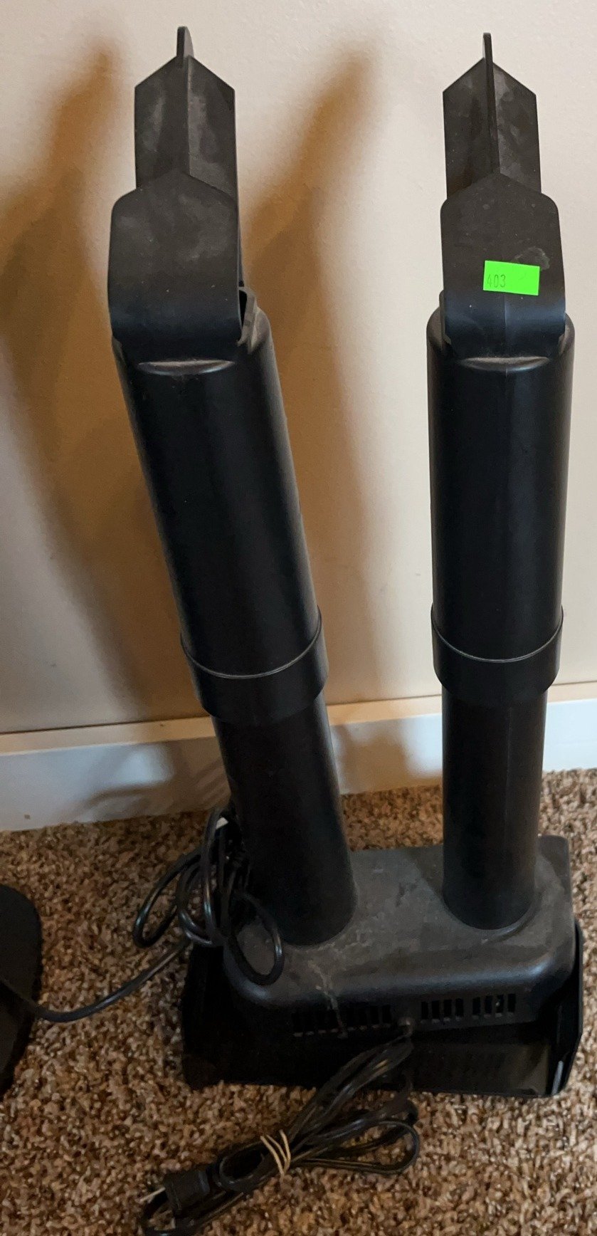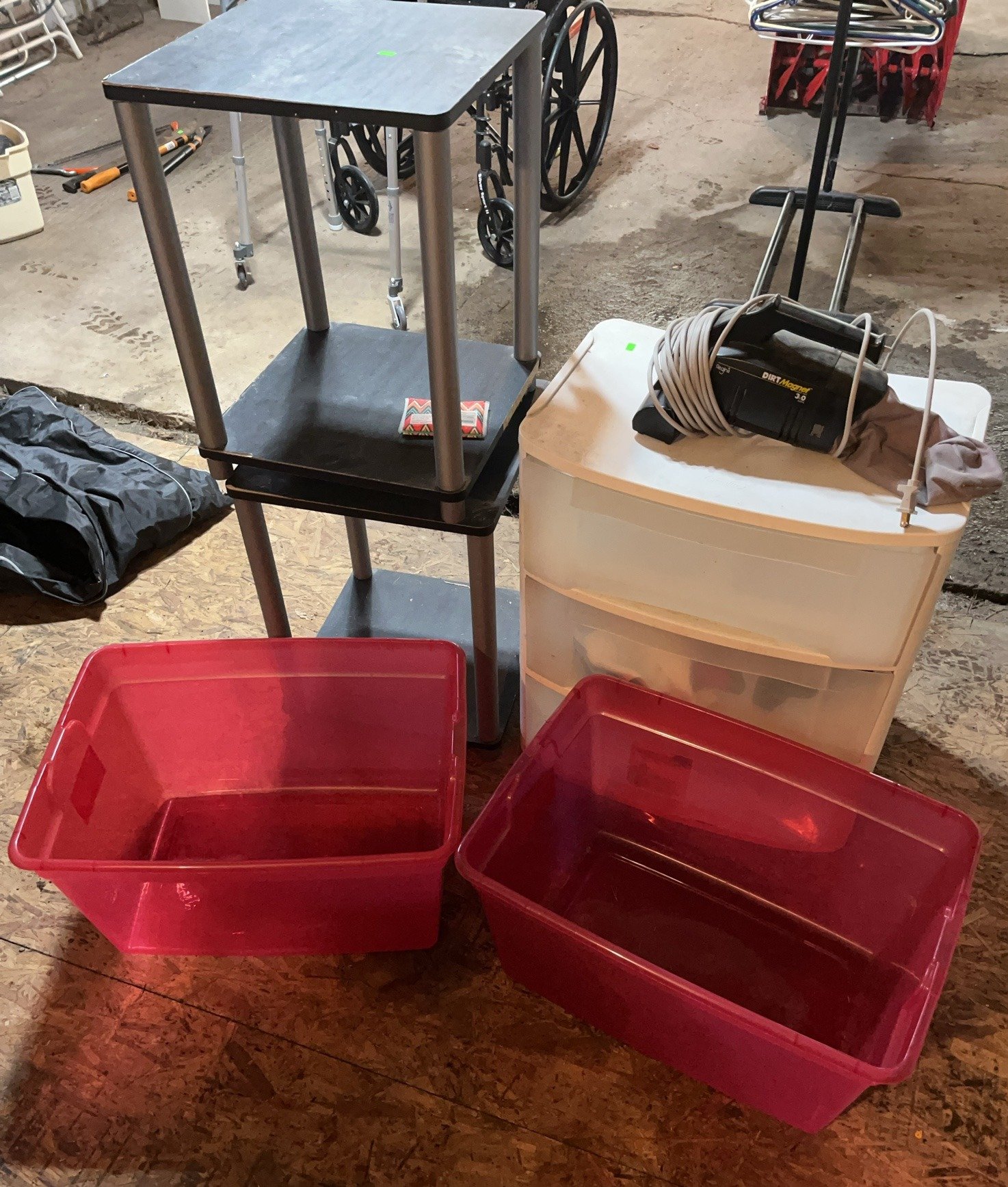 542 2 - Black Wood/Metal Tables, 3 Drawer Plastic Storage Organizer , Dirt Magnet Handheld Vacuum, 2 pink plastic totes