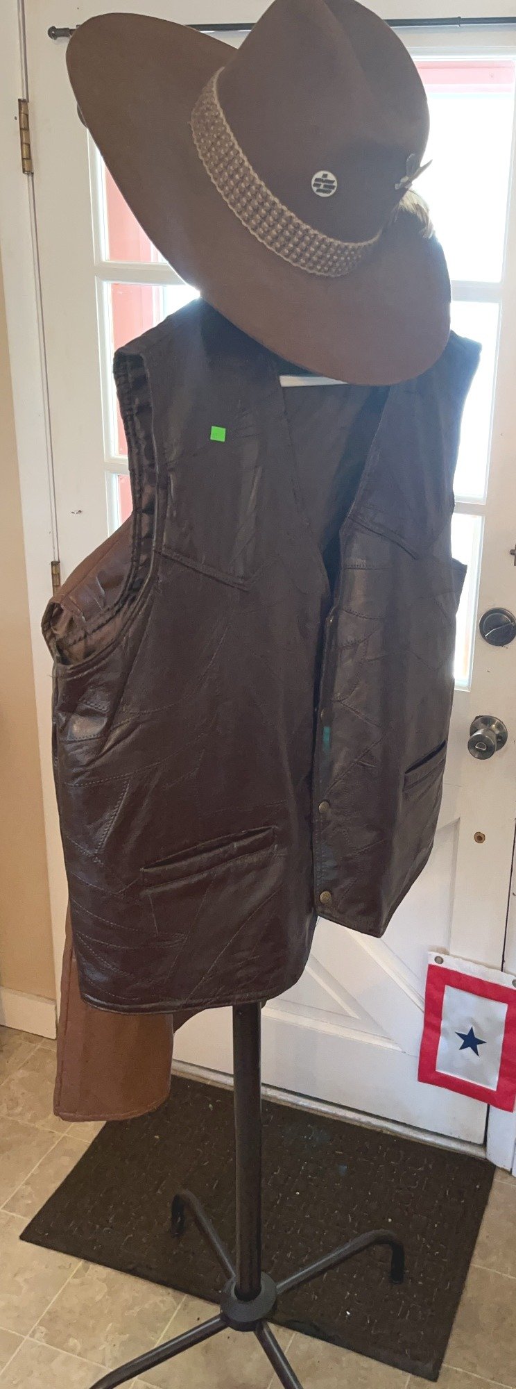 143 Metal Hall Tree, Stetson Brown Leather Hat and 2 - Duke Haband Brown Leather Vests, 7.25, 2XL
