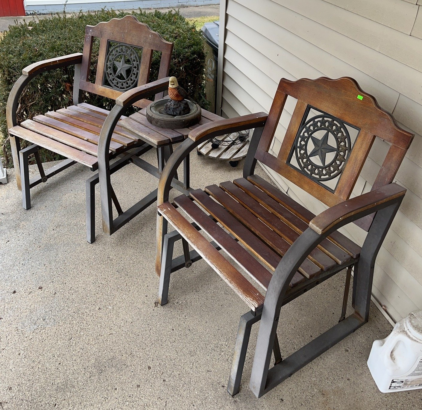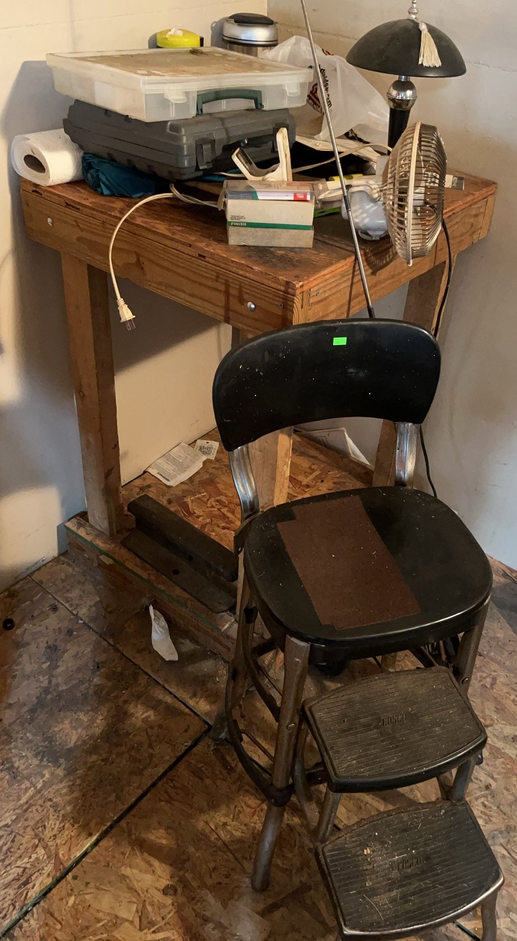 536 Black Retro Chair with Step Stool, Wood Bench , battery operated lantern and fishing pole