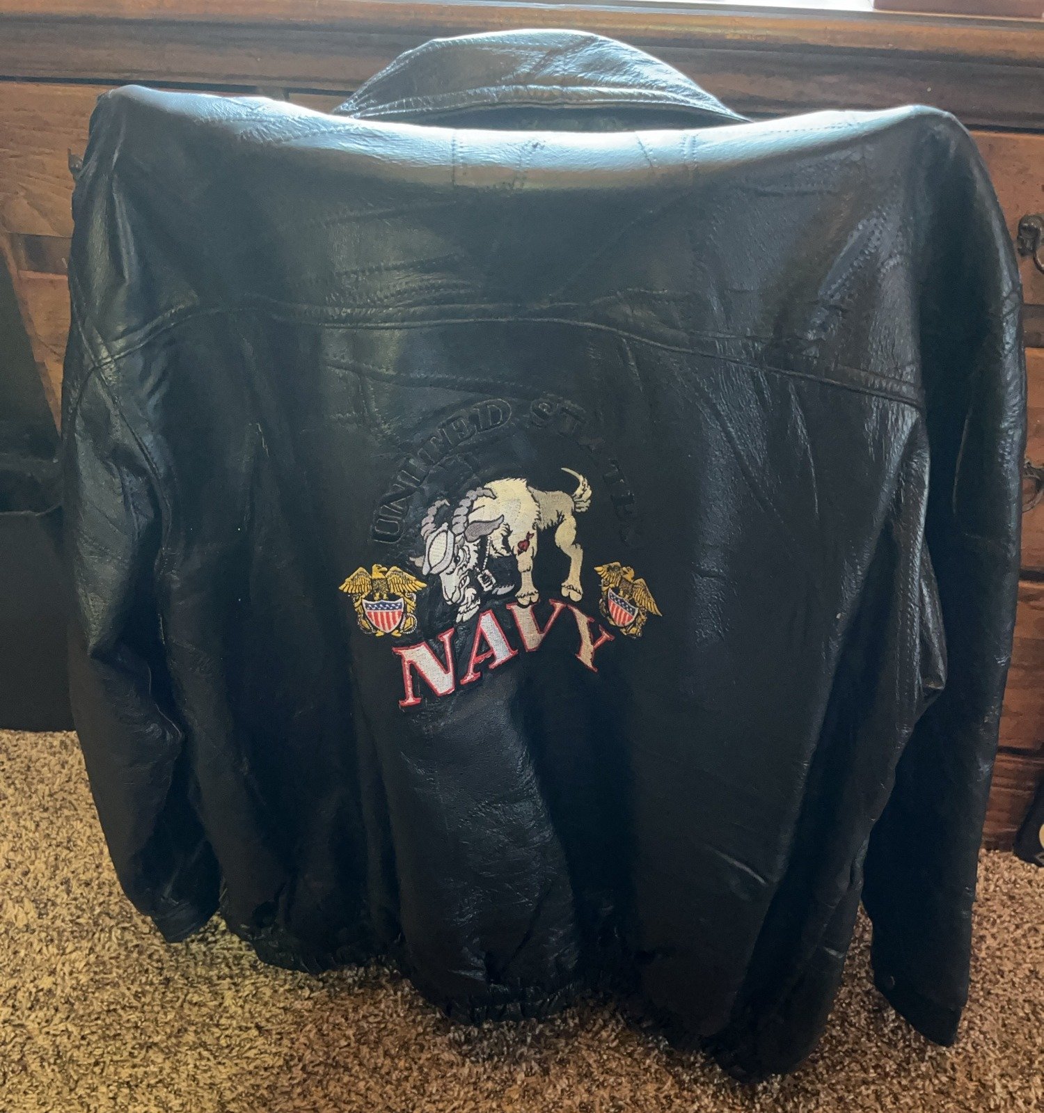 417 Black Leather Jacket with United Stated Navy Stitching, XL