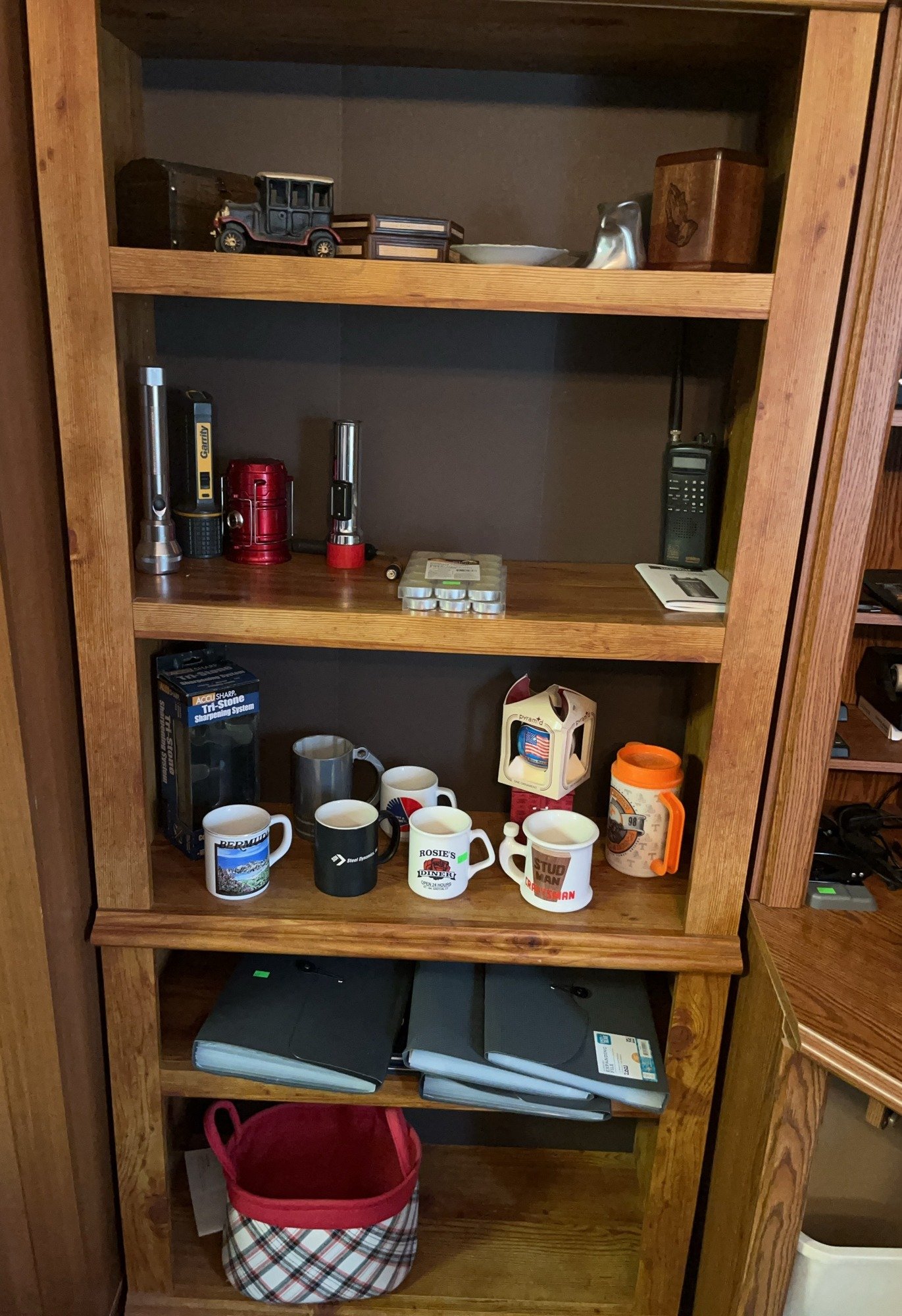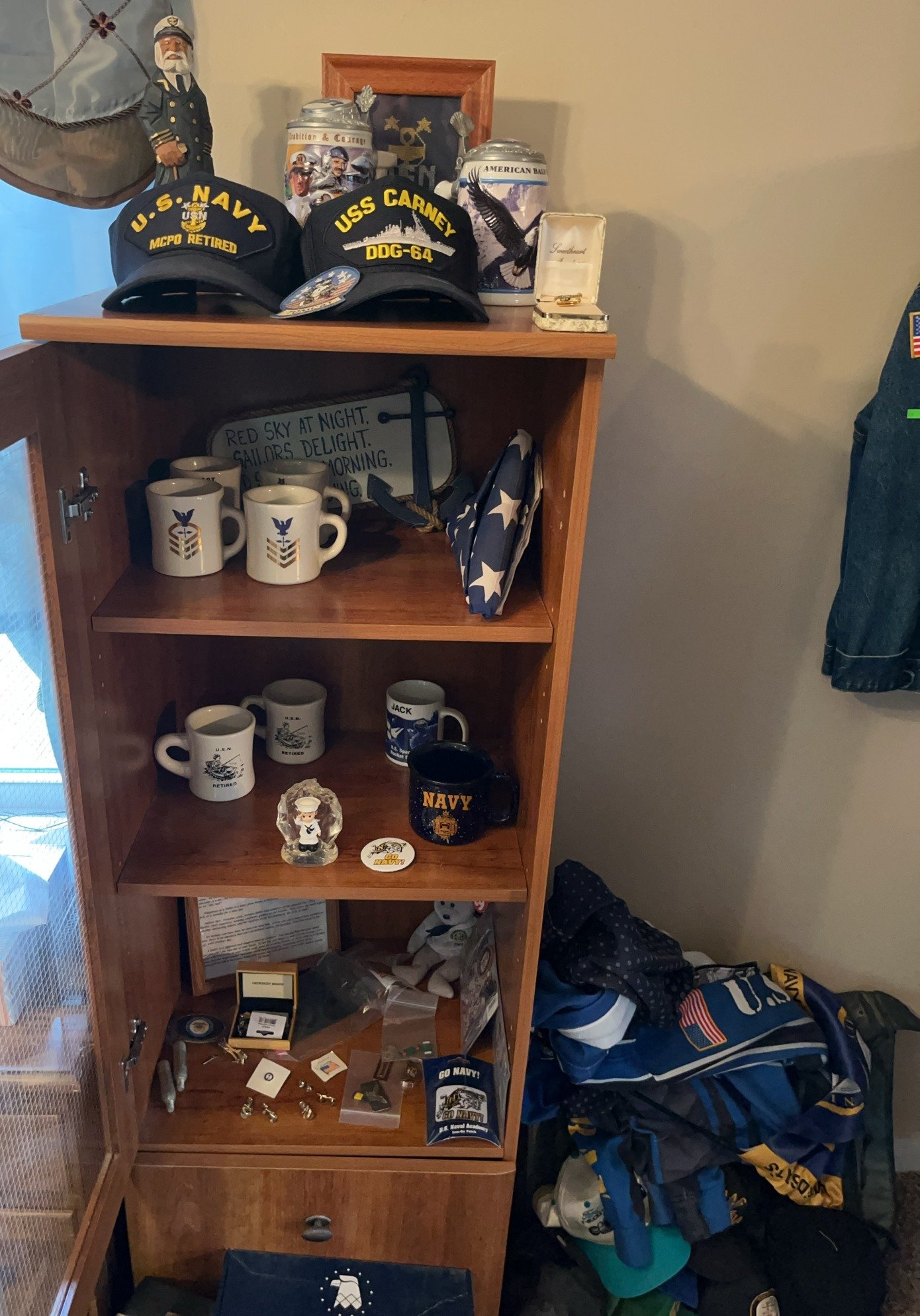 419 US Navy Collectibles: Hats, Belt, Mugs & Steins, Figurines, Briefcase, etc. CONTENTS ONLY, Bookshelf NOT Included