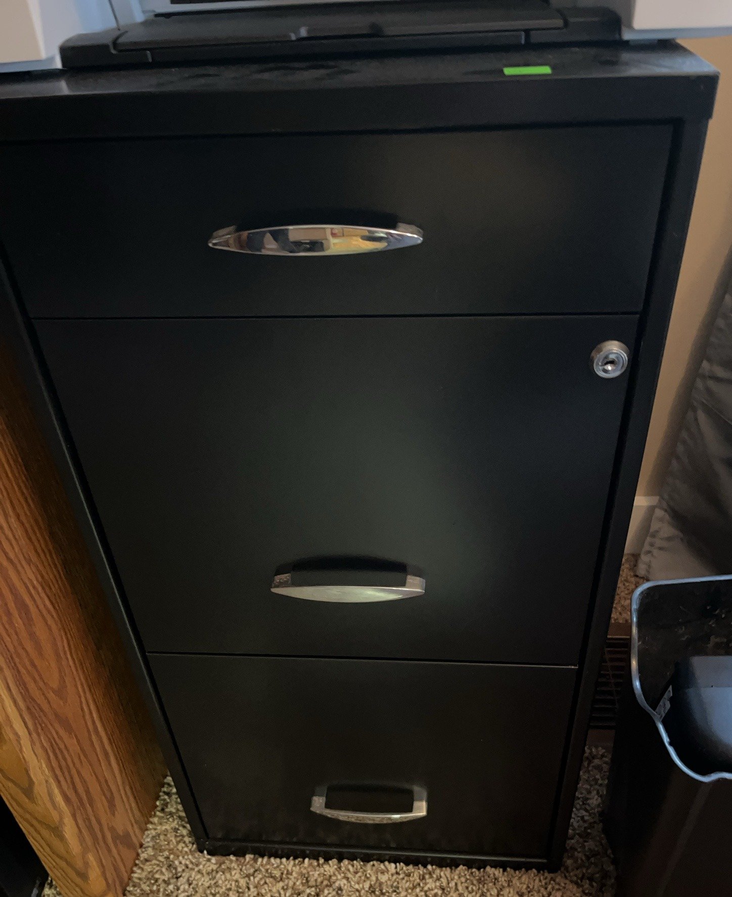 424 Black Metal 2 Drawer Filing Cabinet and Paper Shredder, Contents Included
